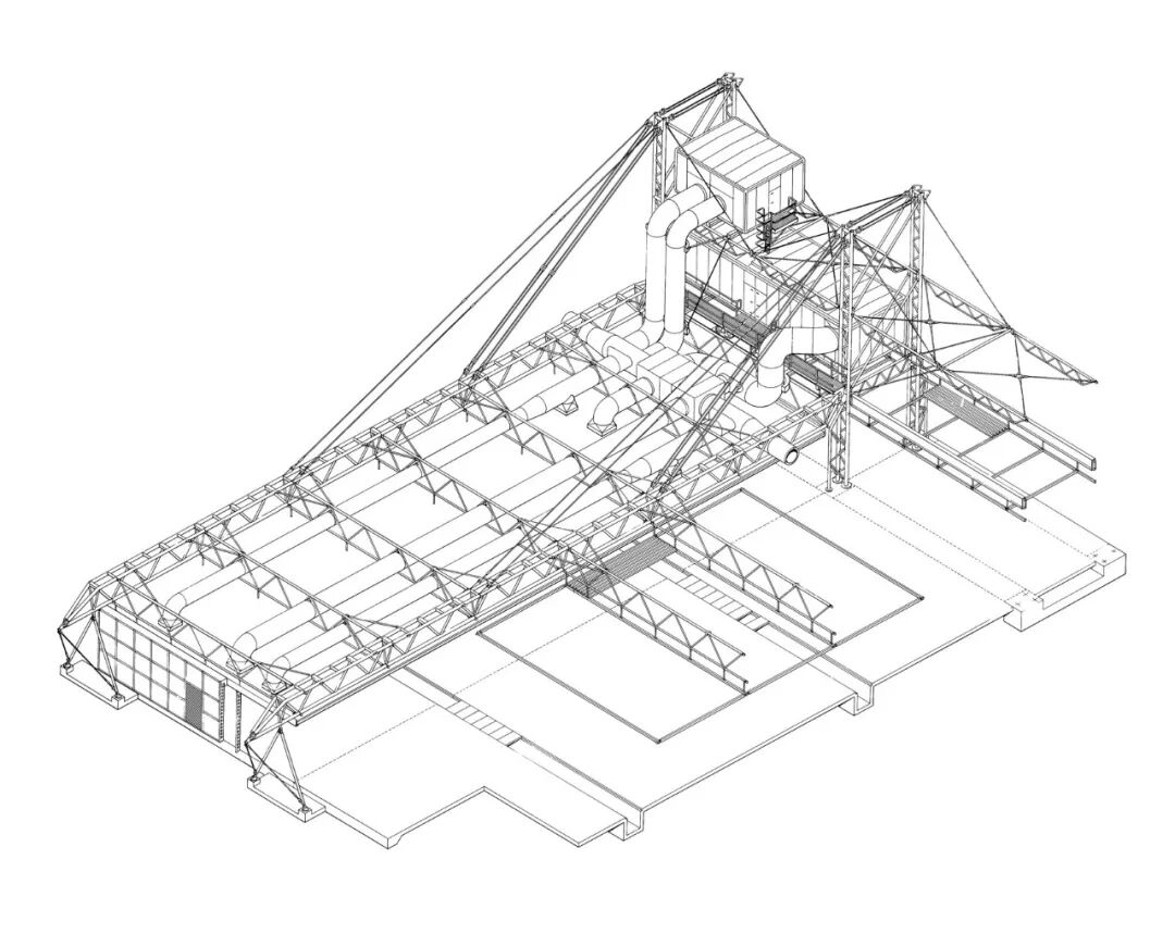 当时,Inmos 要求建筑需要在现场开始施工后的一年内完工,并有可能在不影响生产的情况下进行扩建。Rogers 设计的最终的结构由 16 个大小相等的隔间组成,每个隔间的尺寸为 13 x 36 米,这些隔间逐一建造,形成一个直线型建筑,这个高度灵活的单层钢结构,被设想为可以在任何地方建造的预制部件套件。
