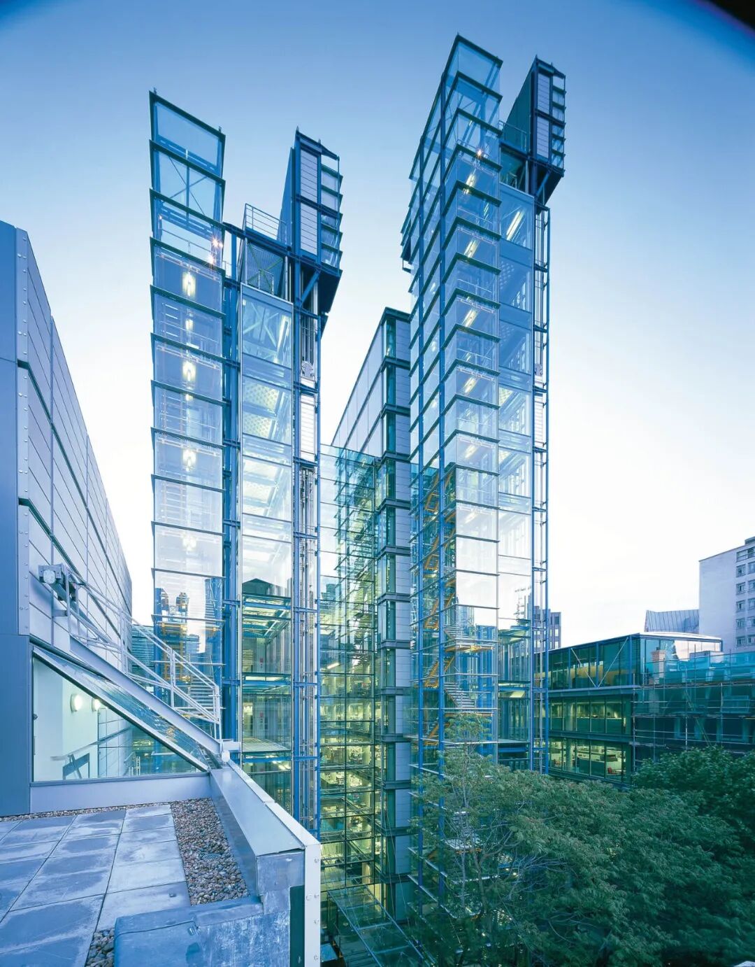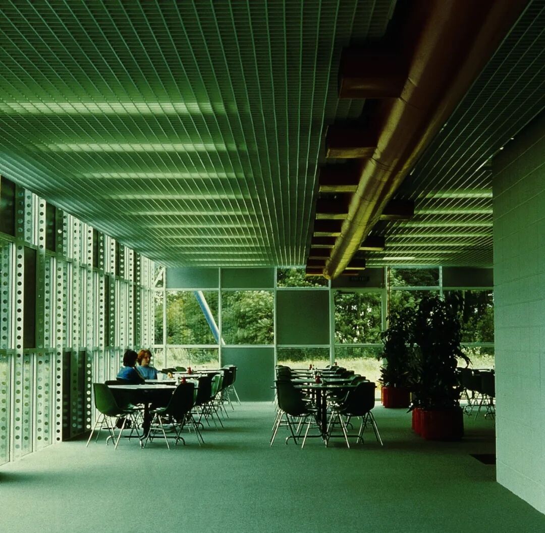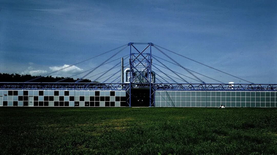 在南威尔士的 Inmos 微处理器工厂,罗杰斯延续了由内而外架构的理念。为了创造微芯片工厂所需的大型柱状空间,建筑物的屋顶由九座由管状钢制成的蓝色塔楼支撑。