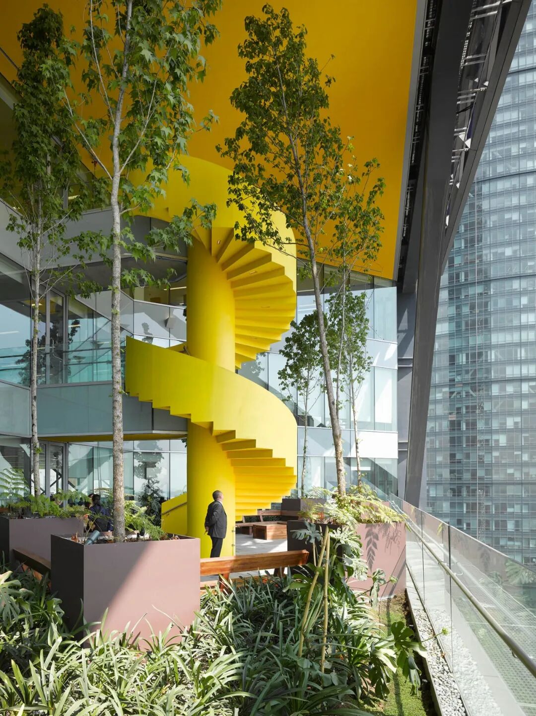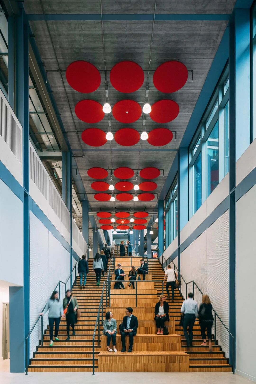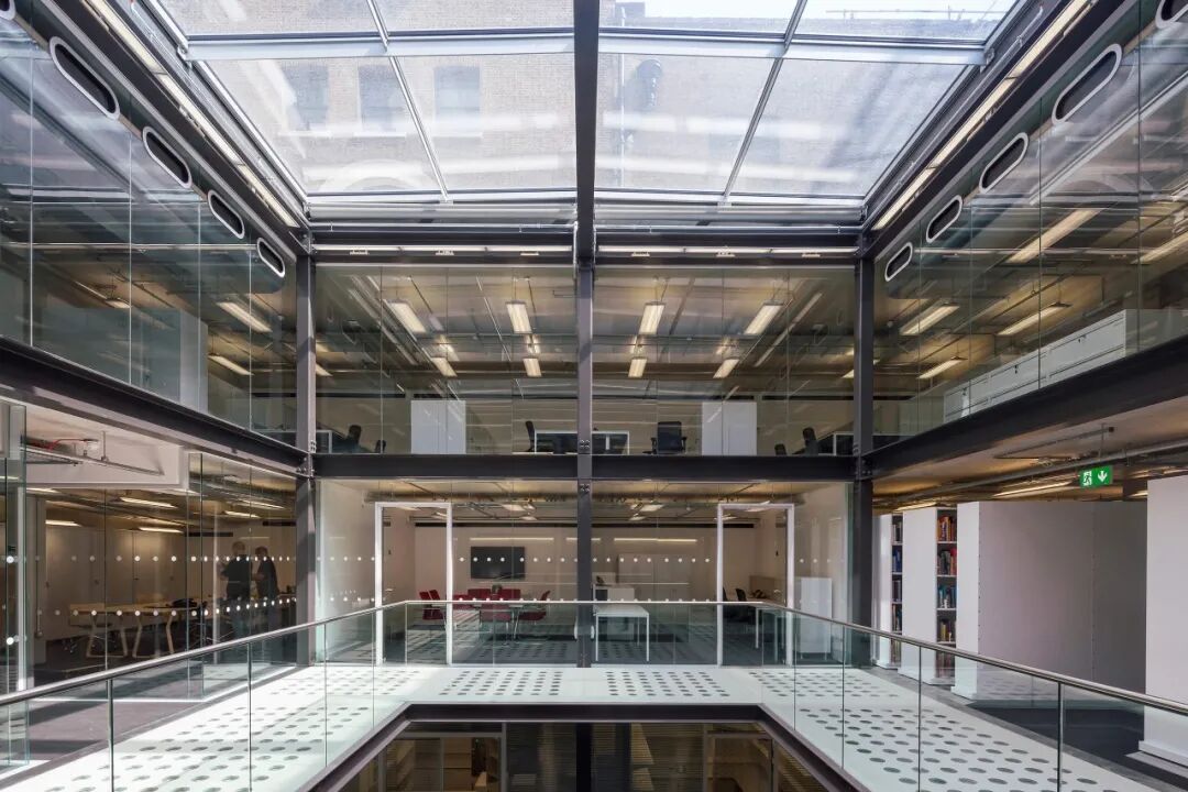 该建筑6层到14层为办公空间,有两个地下室,总面积24000平方米。呼应场地的形状,新建筑围绕着锥形的楼板构造,在两个中庭空间周围创建了扇形网格。这些中庭,以及内部和外部庭院,让日光得以渗透到建筑的中心。