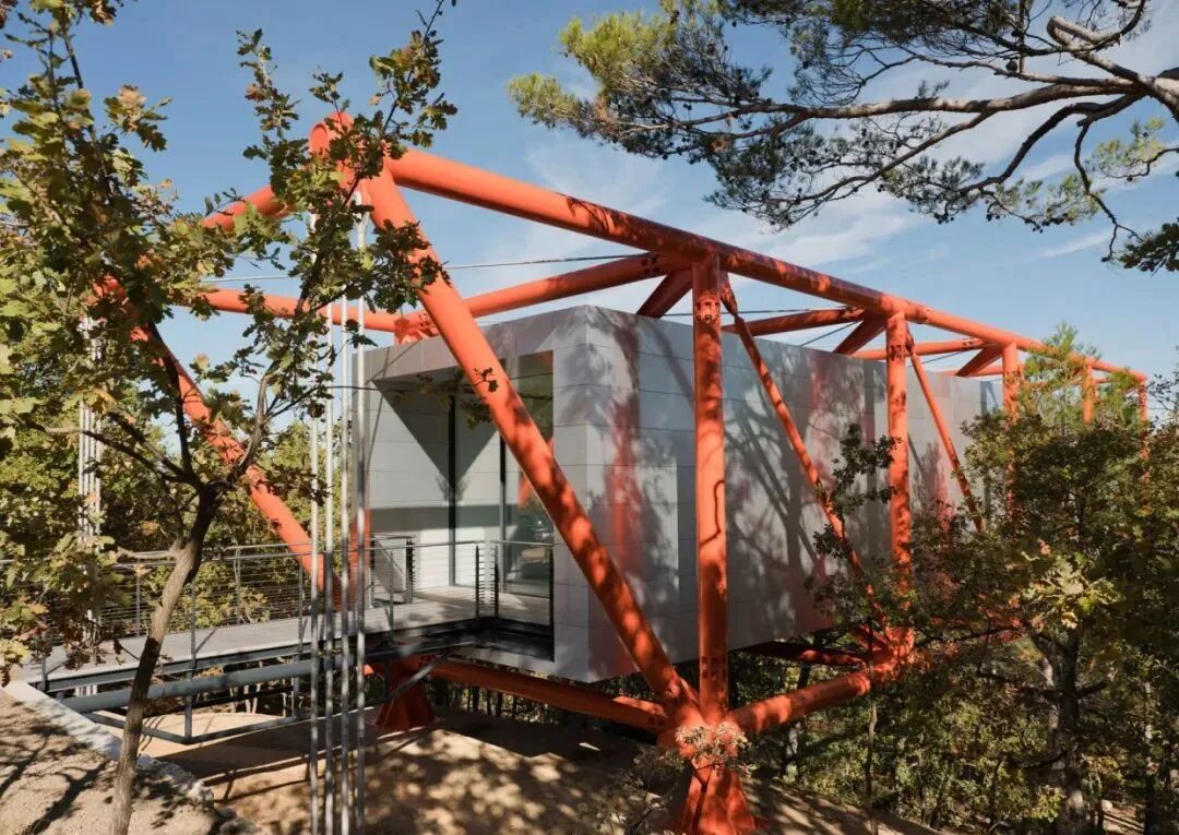 建筑外部的橙色钢梁沿悬挑方向逐渐变细。建筑接触地面的地方做得非常巧妙,掩盖了足以从一端支撑整个结构的坚实的地下工程。建筑的工业本质,加上优雅的手工细节,使其成为景观中的雕塑。
