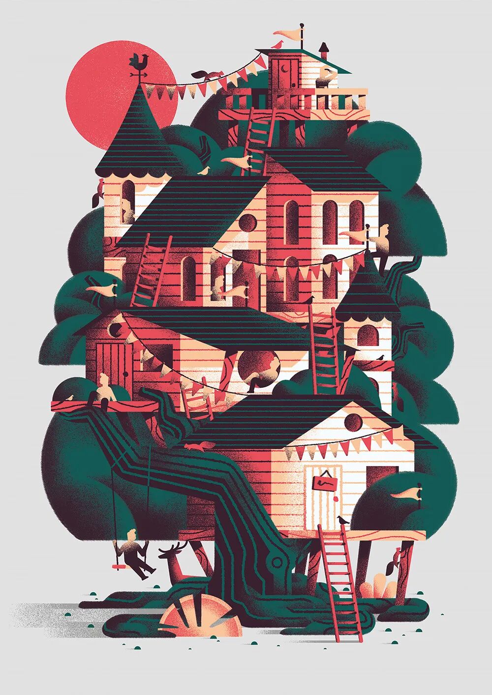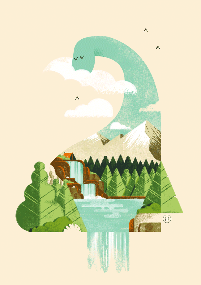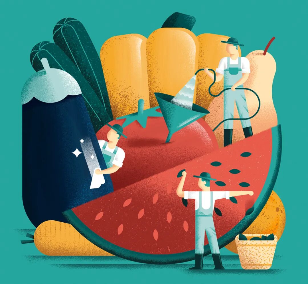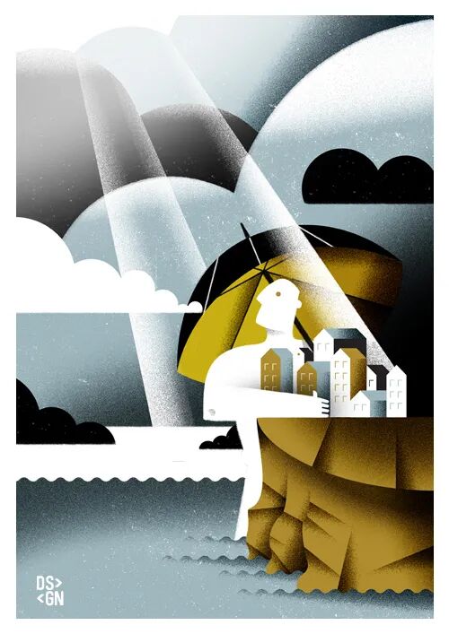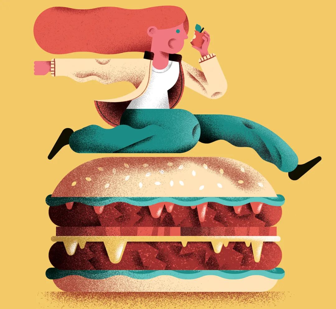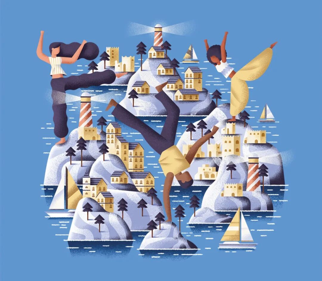 Daniele Simonelli在扁平的画面中加上肌理噪点,让插画变得更有质感。通常运用大量渐变,营造出色彩鲜明、对比强烈的光感,自然的笔触以及随性的色彩半点给画面增加细节。