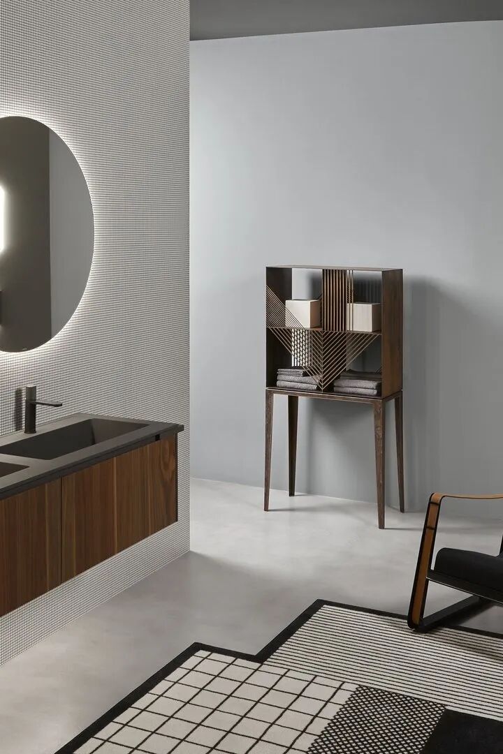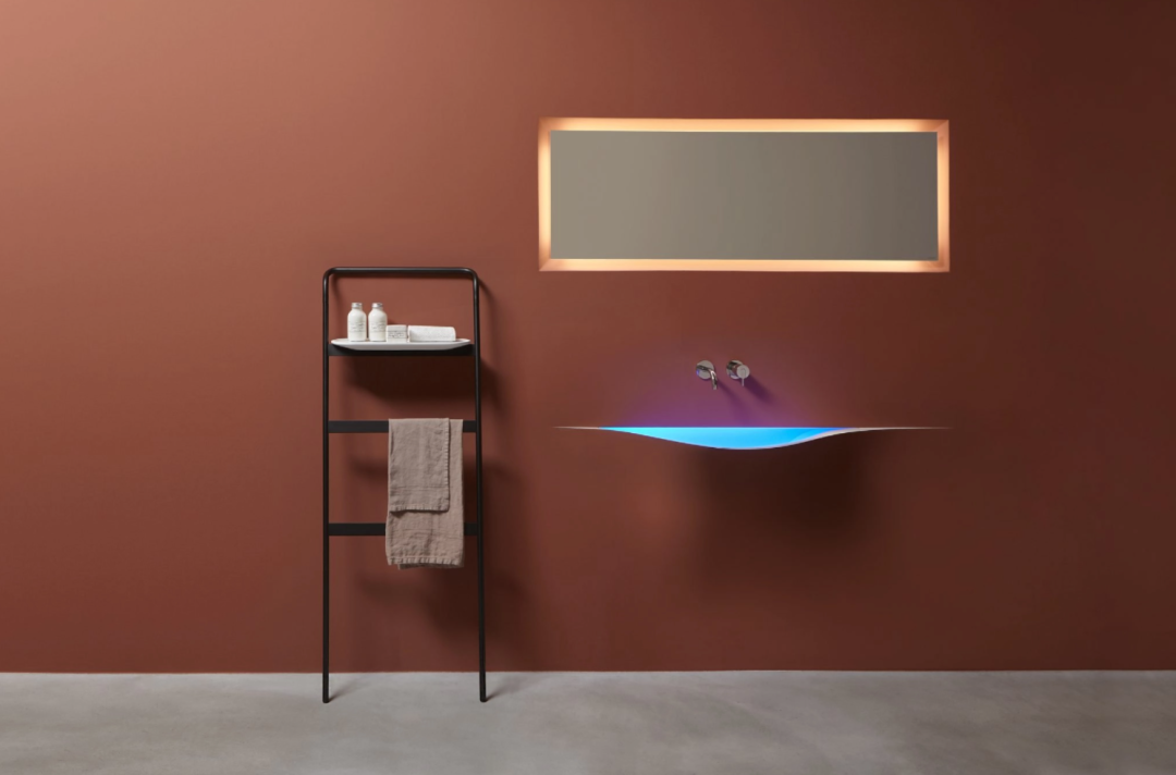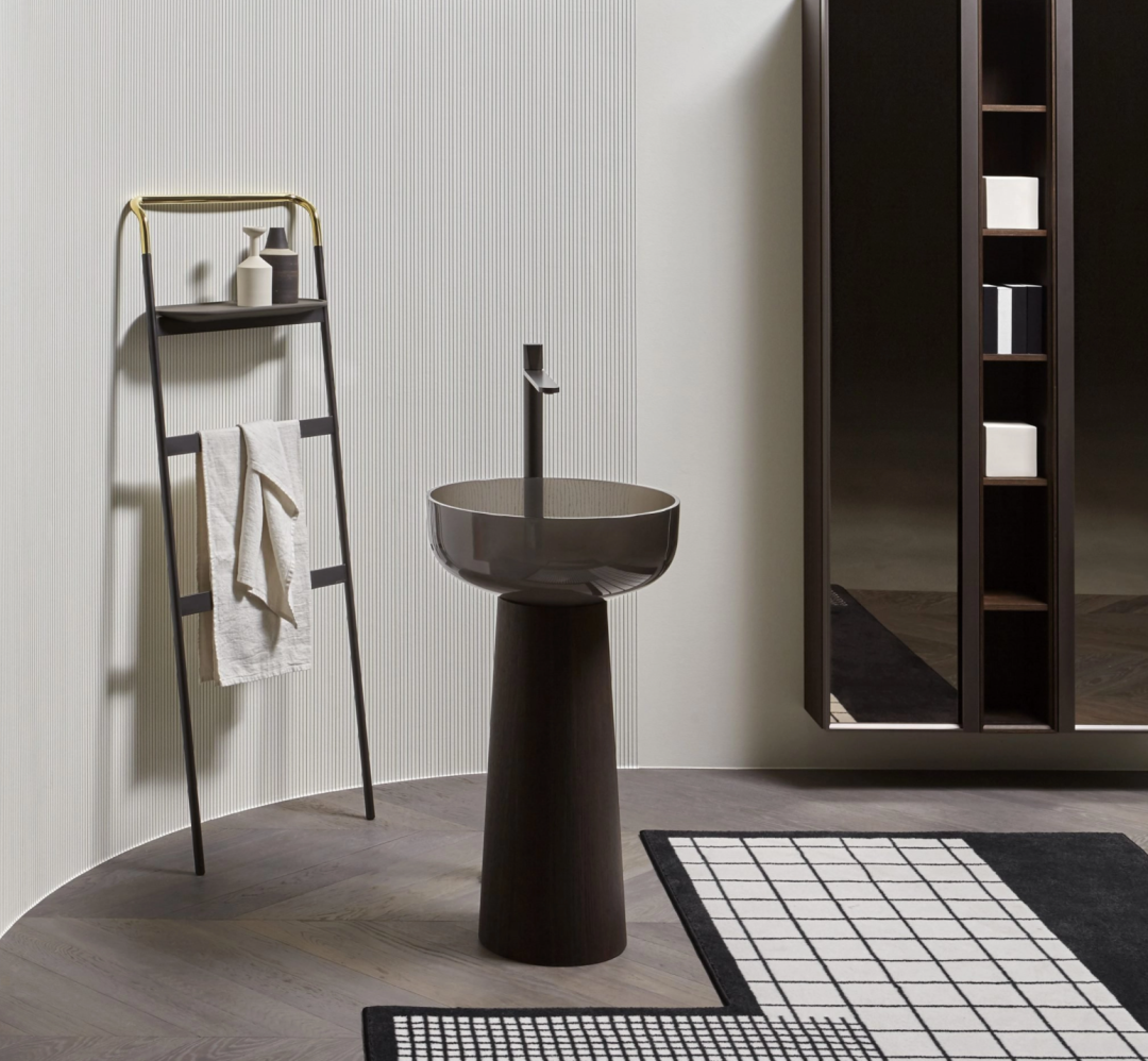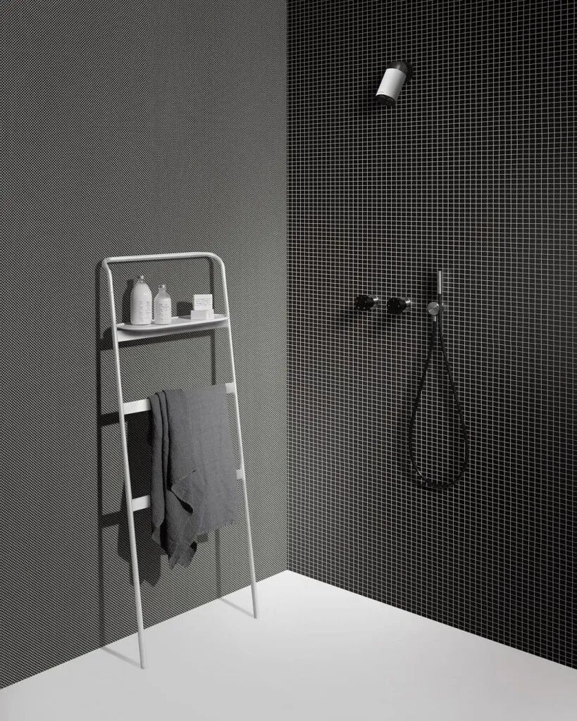 日常仪式变得简单,一个可以根据空间组成自由定位的游荡物,以满足使用它的人不断变化的需求。它可以放置在水槽区、卫生洁具附近、淋浴间或浴缸附近。