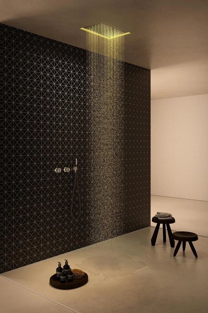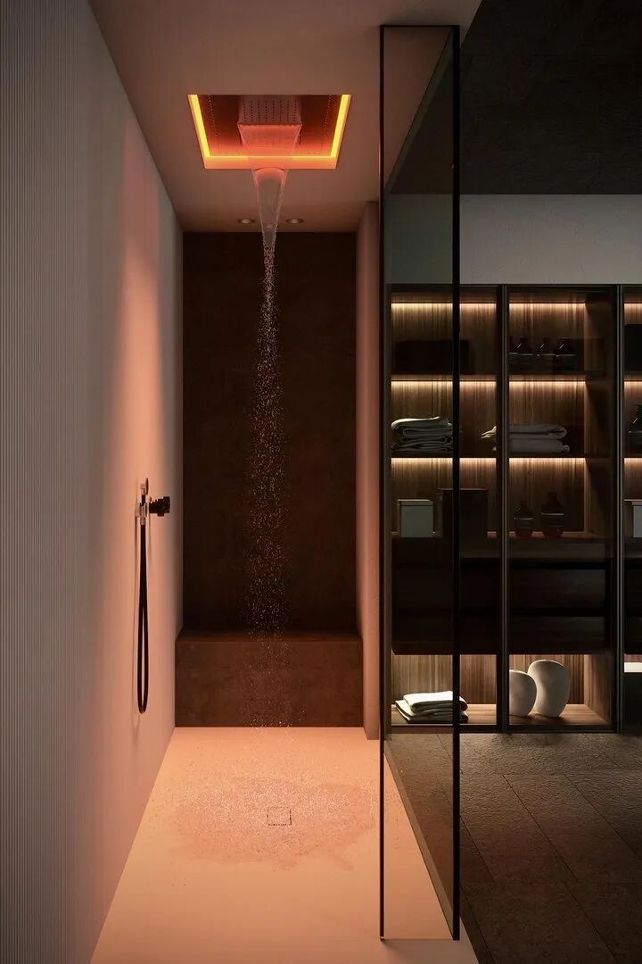Meteo 是一款封闭式淋浴喷头,采用镜面不锈钢或白色饰面,可集成 led rgb 照明(色光疗法)并包括遥控器。正方形或长方形,周边花洒或中心瀑布(仅限长方形)。