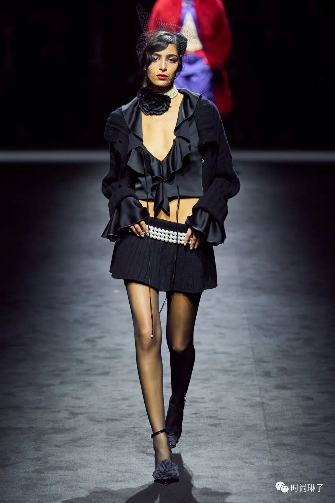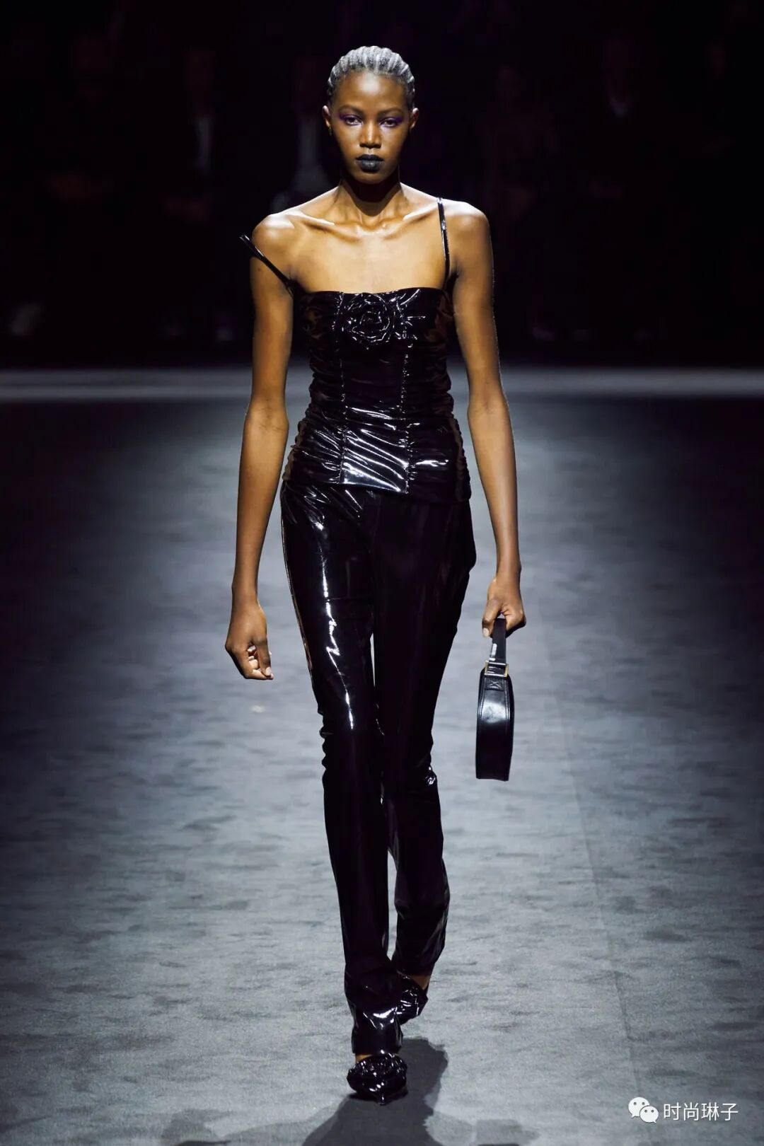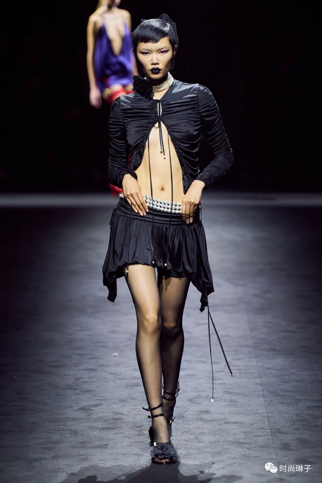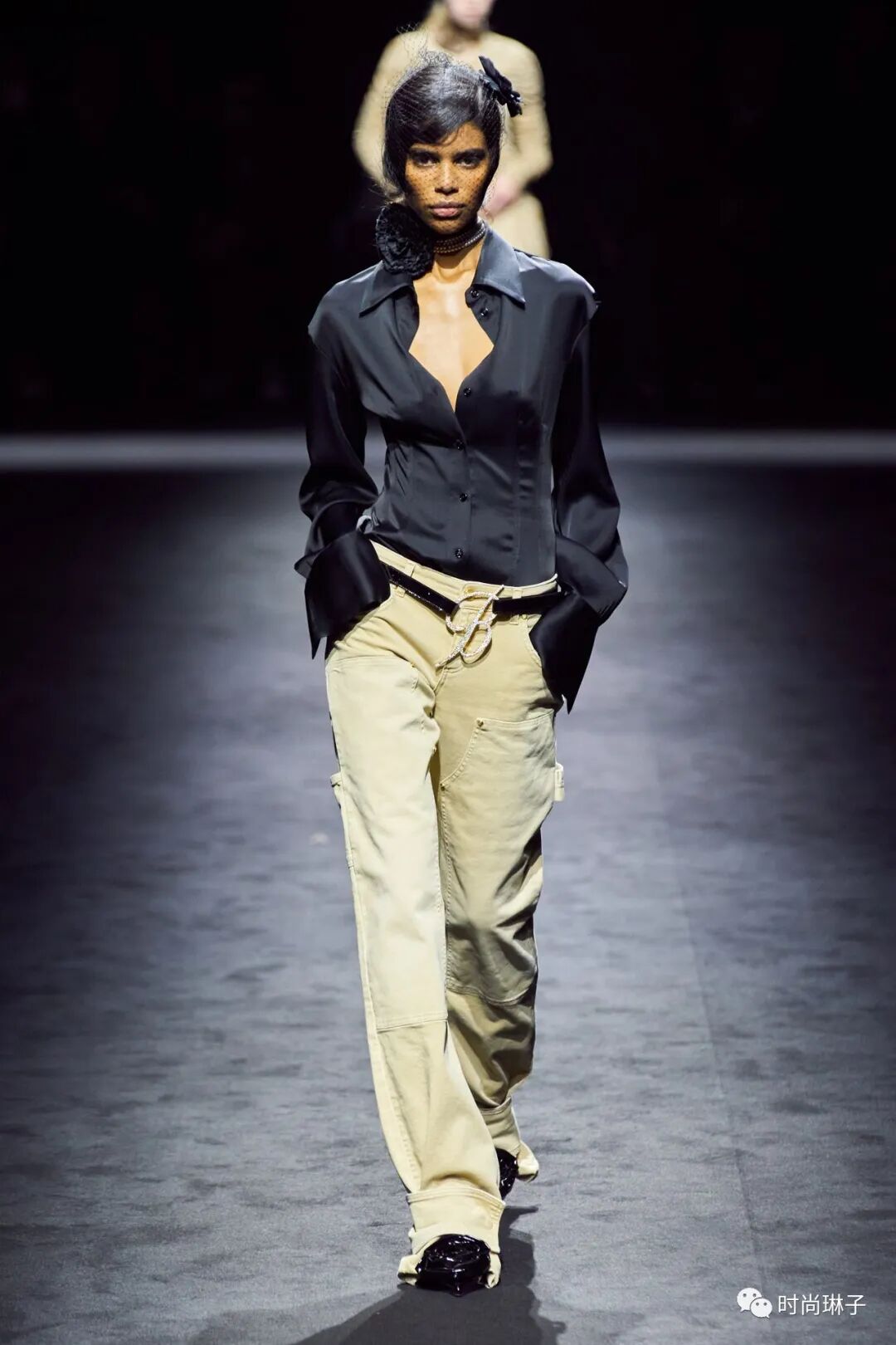 该系列还延续了品牌近几季的Y2K千禧年风格。露腰上衣,低腰裤以及迷你裙等俏皮又流行的辣妹造型,搭配外套或风衣,流行且性感。