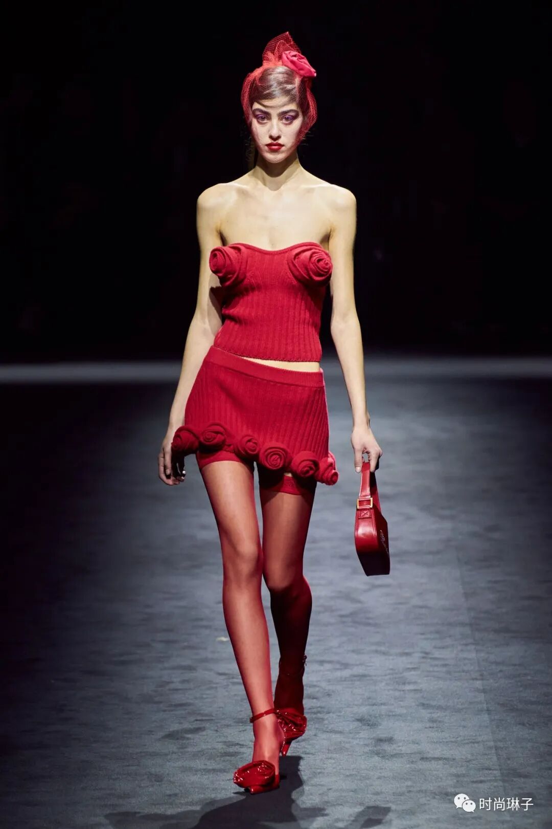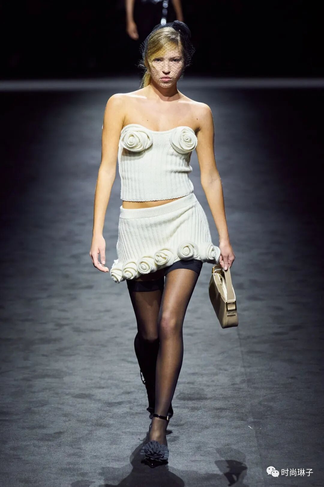 品牌标志性的玫瑰以立体花的形式装饰着领口,上衣胸部和短裙下摆。