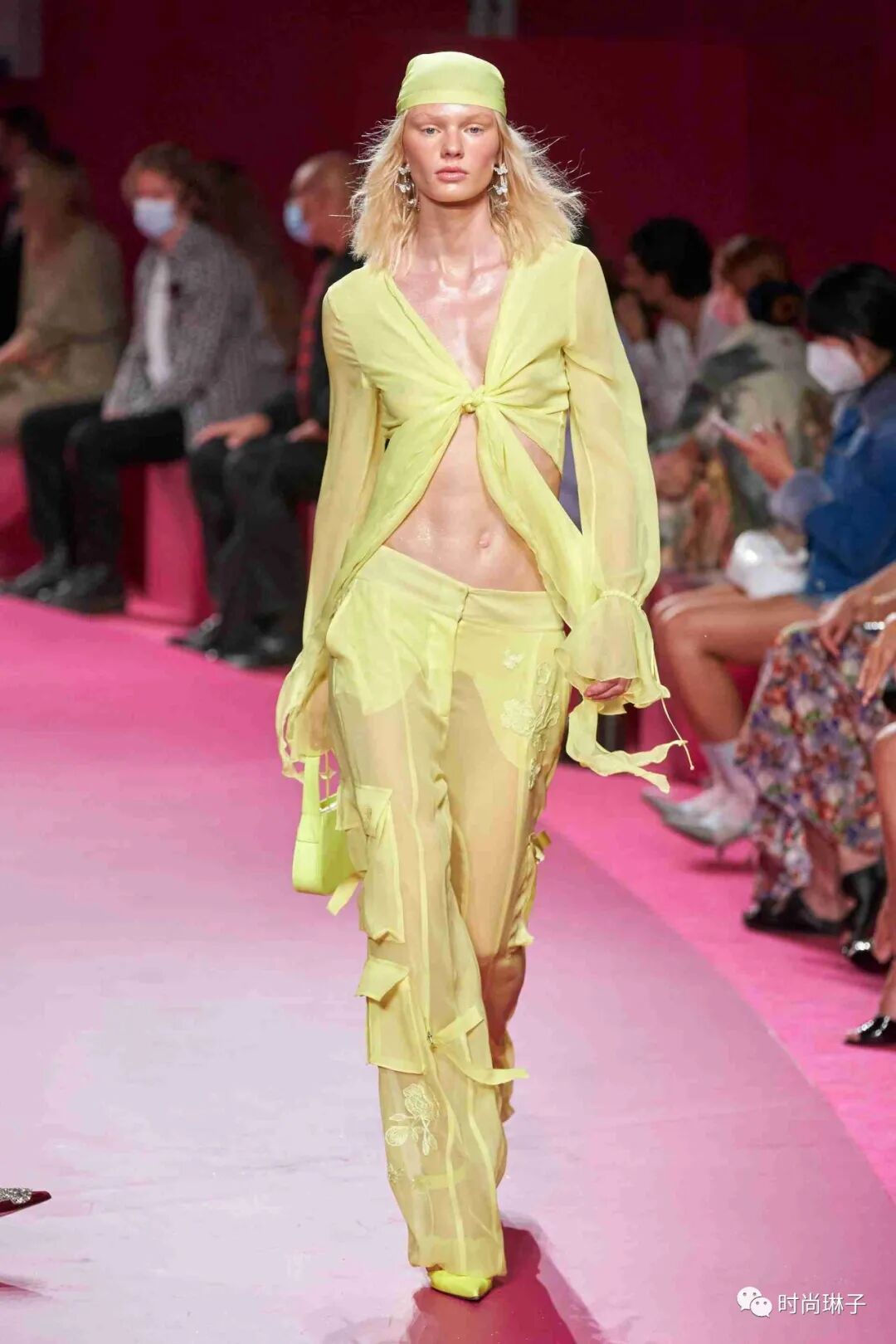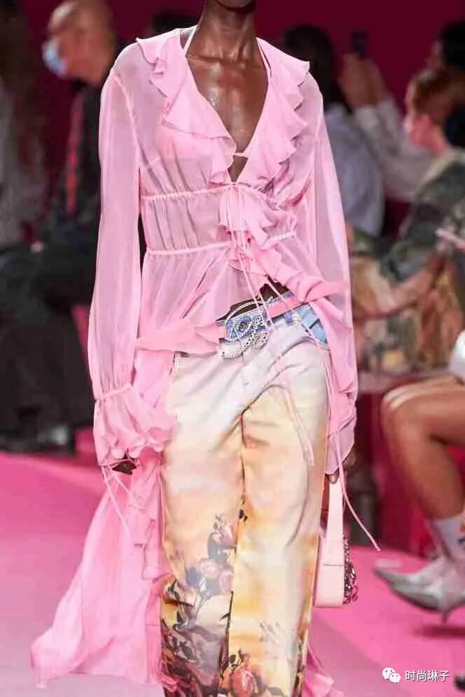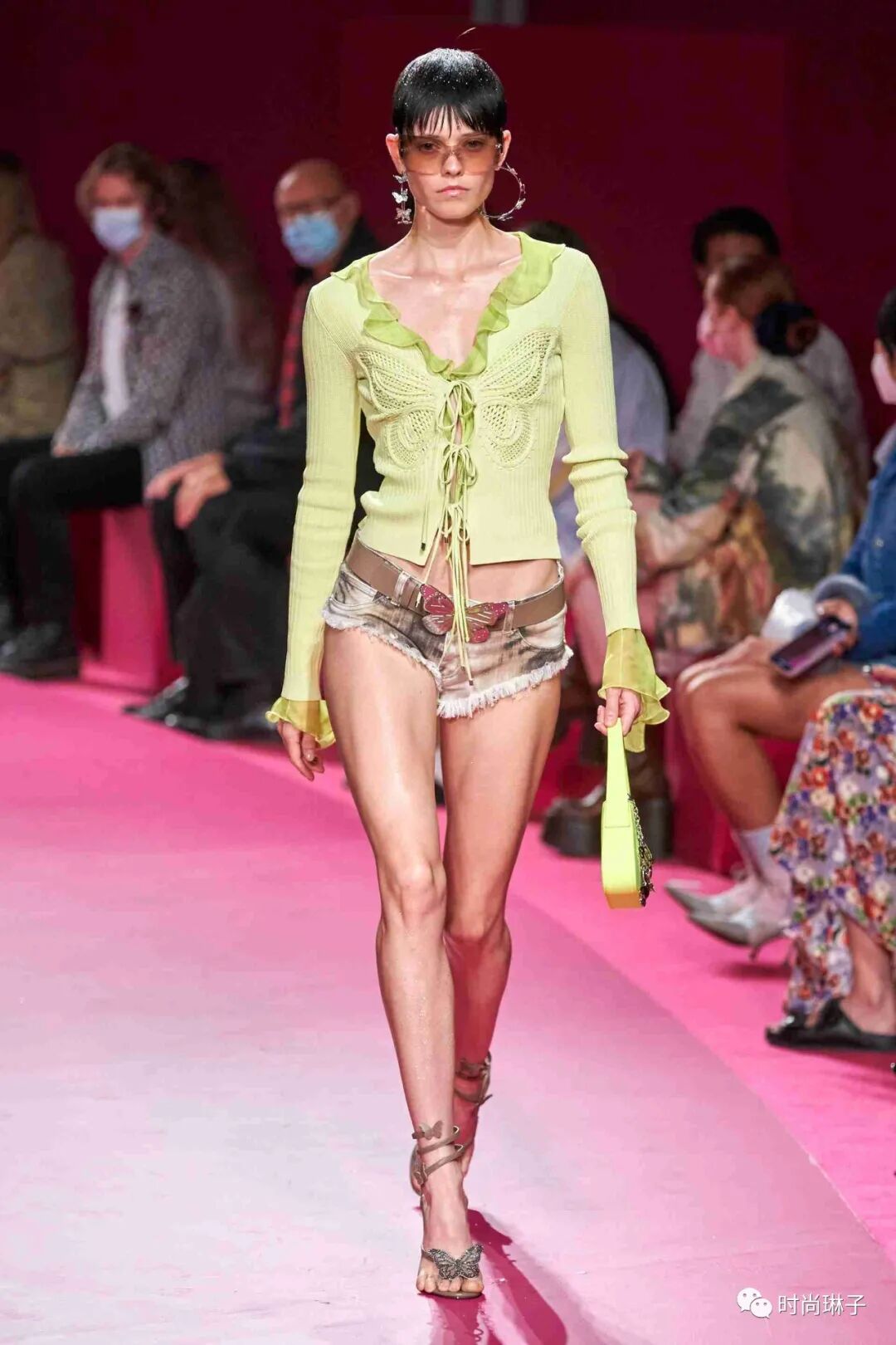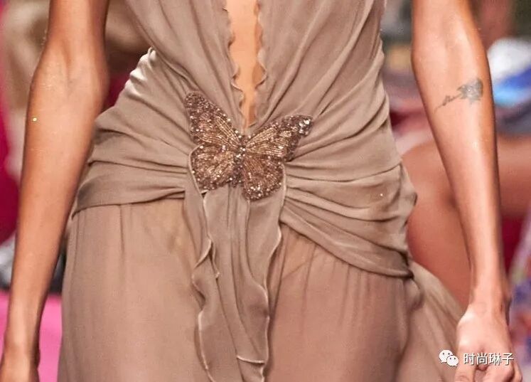 蝴蝶象征重生和自由,Nicola Brognano成为品牌创意总监后,蝴蝶也成为了Blumarine的新标识,无处不在的修饰着该季的整体造型。
