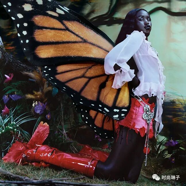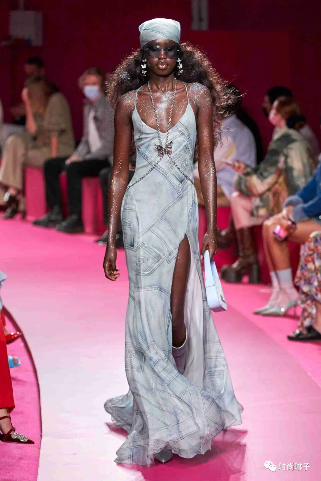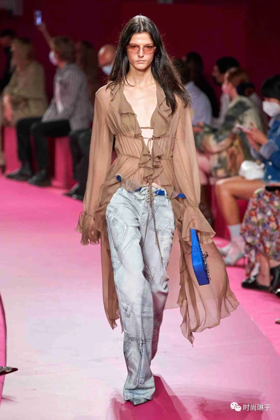 蝴蝶象征重生和自由,Nicola Brognano成为品牌创意总监后,蝴蝶也成为了Blumarine的新标识,无处不在的修饰着该季的整体造型。