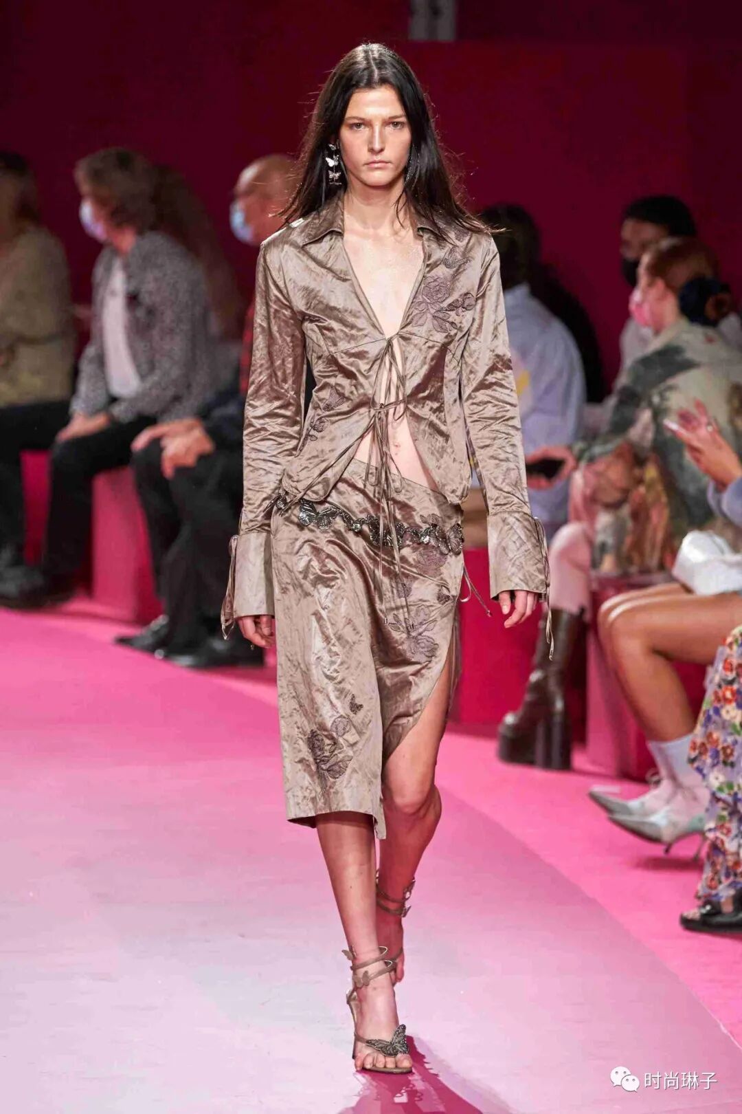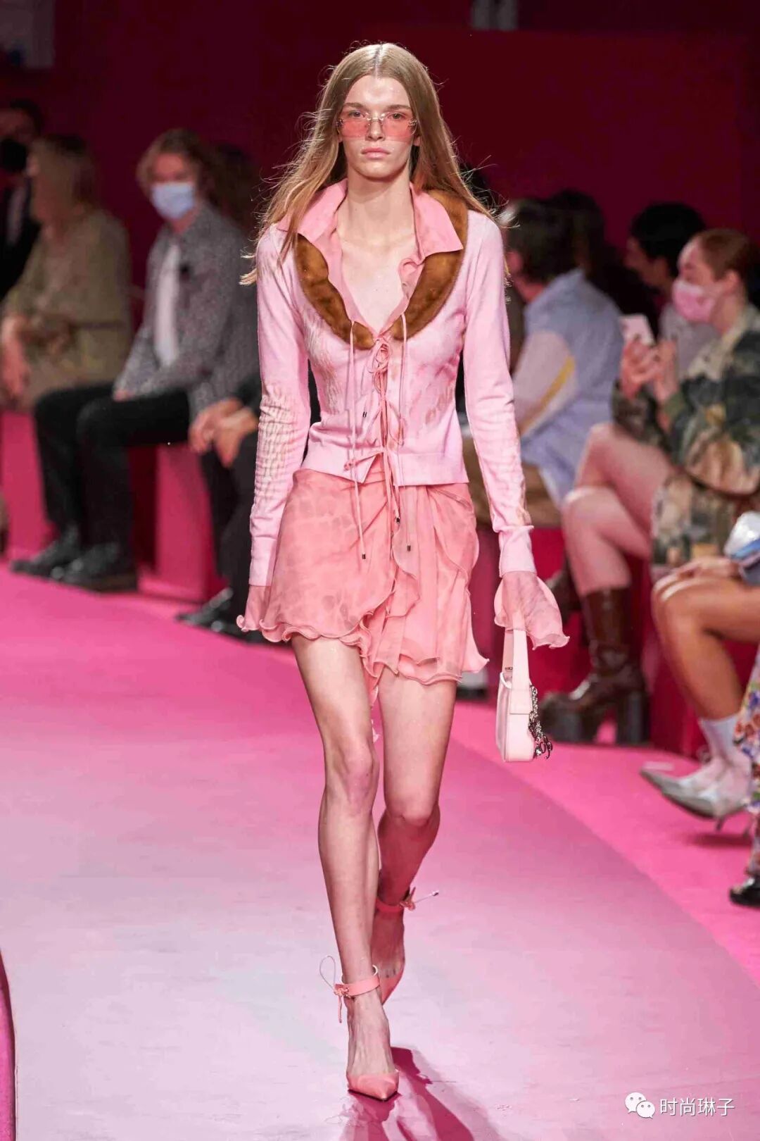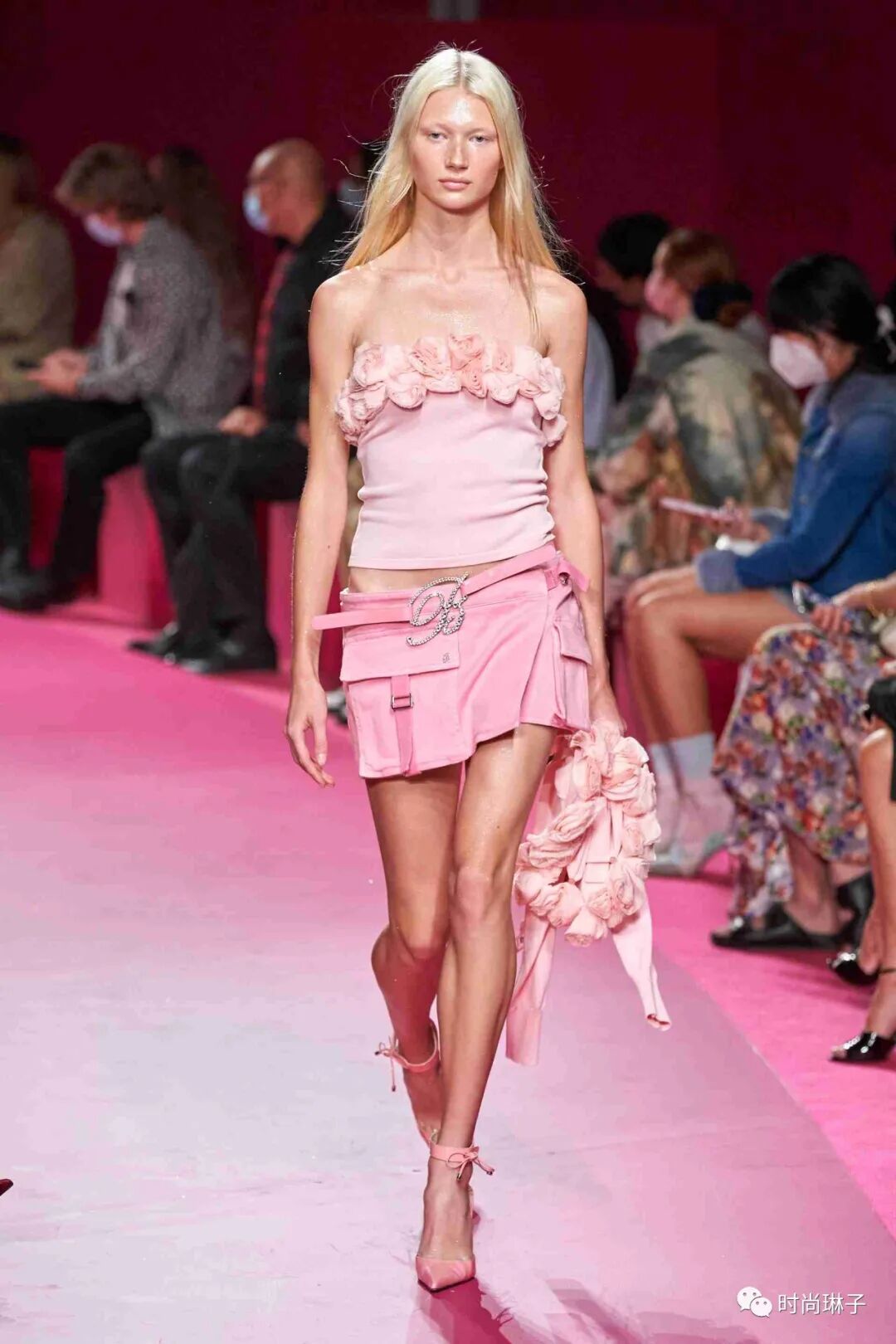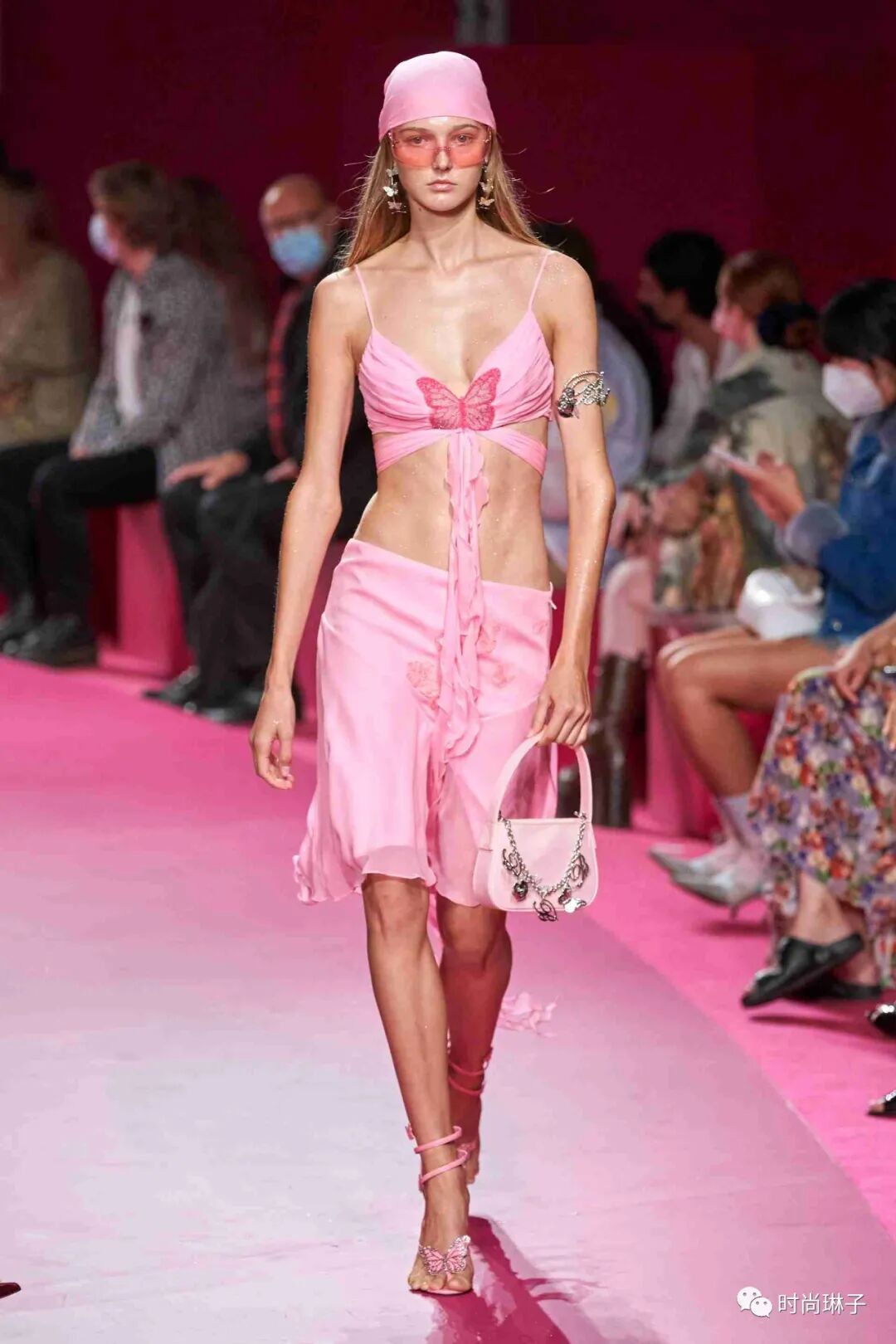 Blumarine 上一季的2021秋冬系列灵感来自2000年代初期的时尚偶像:布兰妮Britney Spears 和希尔顿 Paris Hilton,而2022 春夏系列延续了上一季的Y2K千禧年风格,以“Beat”为主题,重新诠释了性感浪漫的复古美学。