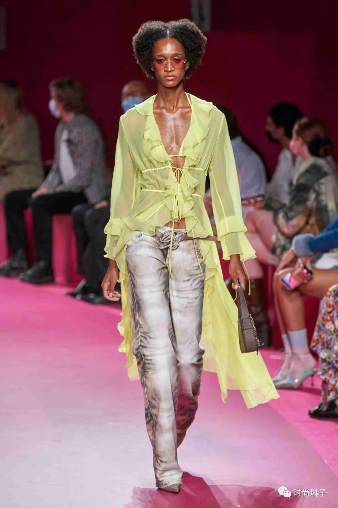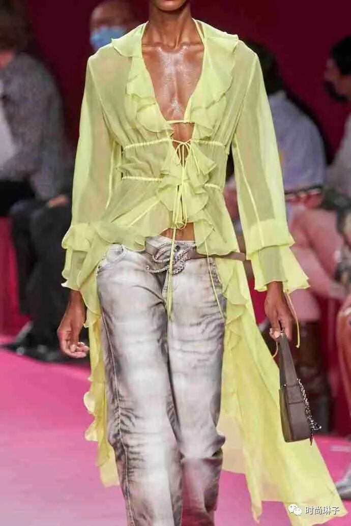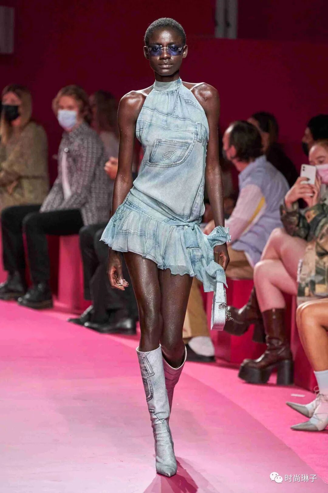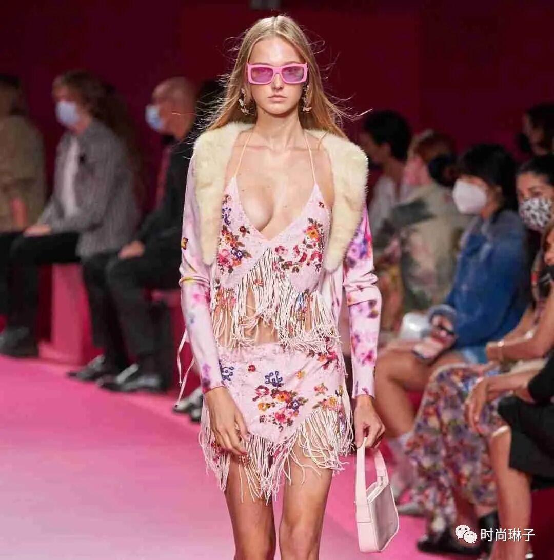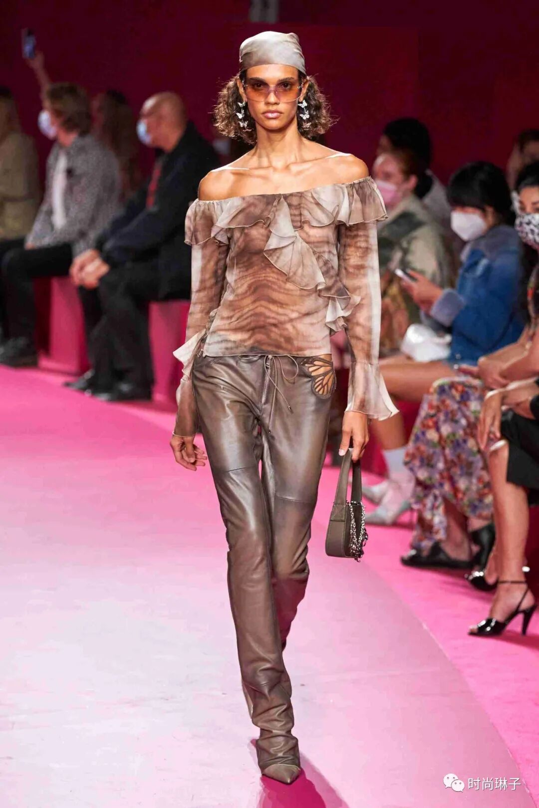 Blumarine 上一季的2021秋冬系列灵感来自2000年代初期的时尚偶像:布兰妮Britney Spears 和希尔顿 Paris Hilton,而2022 春夏系列延续了上一季的Y2K千禧年风格,以“Beat”为主题,重新诠释了性感浪漫的复古美学。