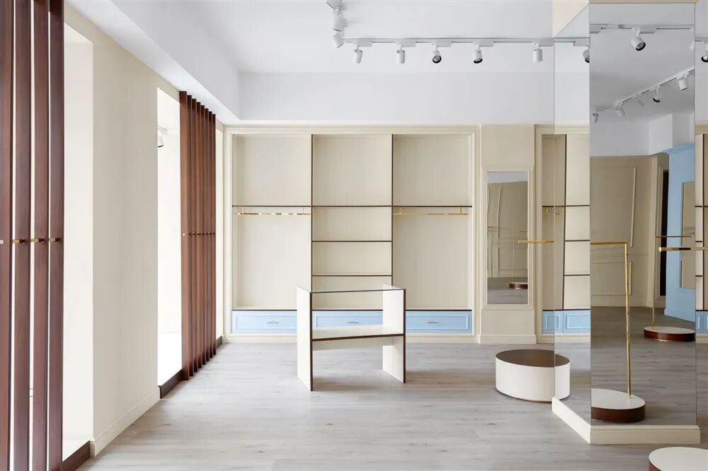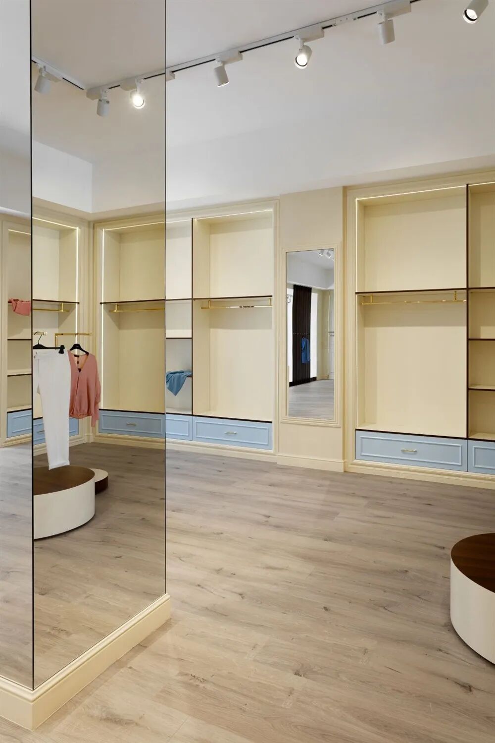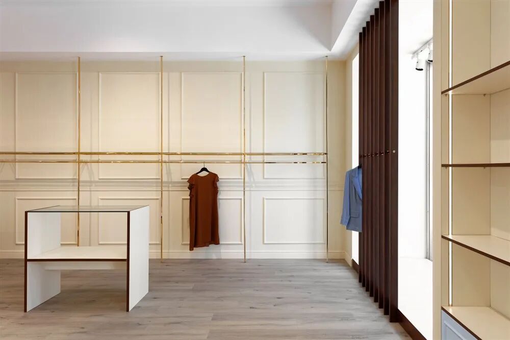 该空间的设计具有最大的灵活性:事实上,所有的水平货架都可以随意移动,并改变服装的展示,而四个圆柱形角落和三个展示台在空间中自由移动,以打破木地板的连续配色方案。