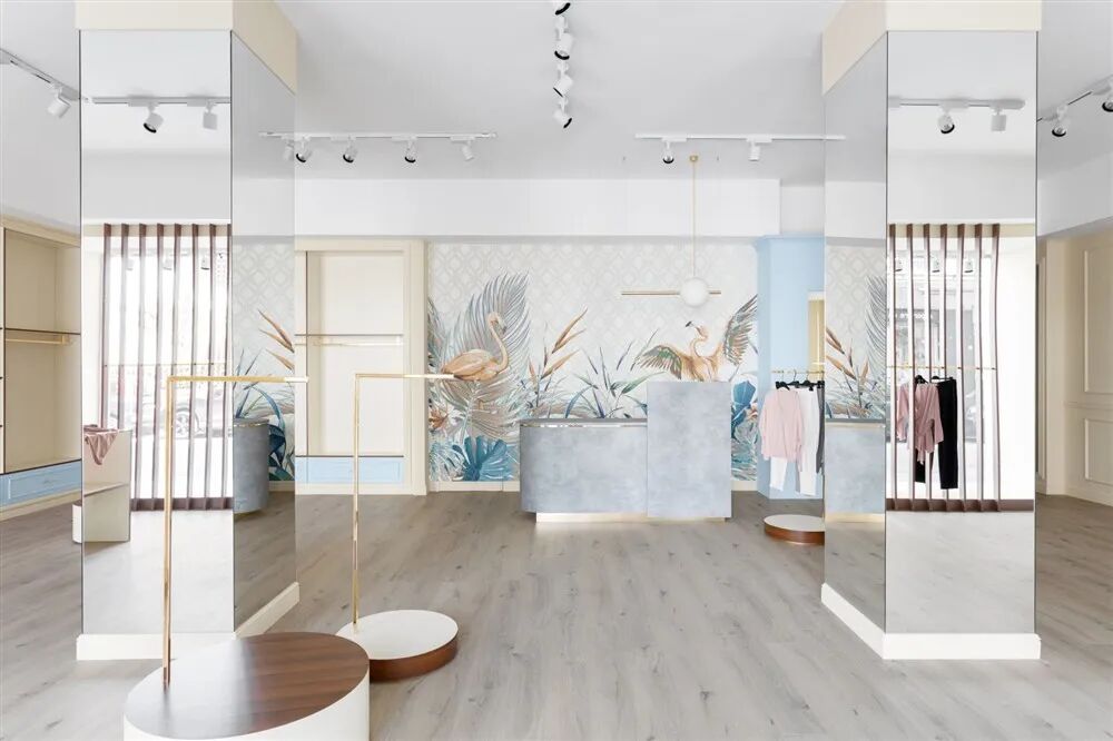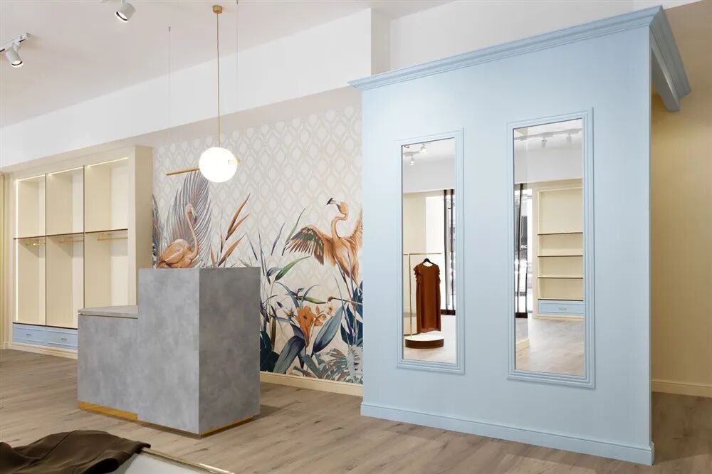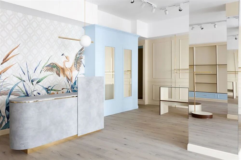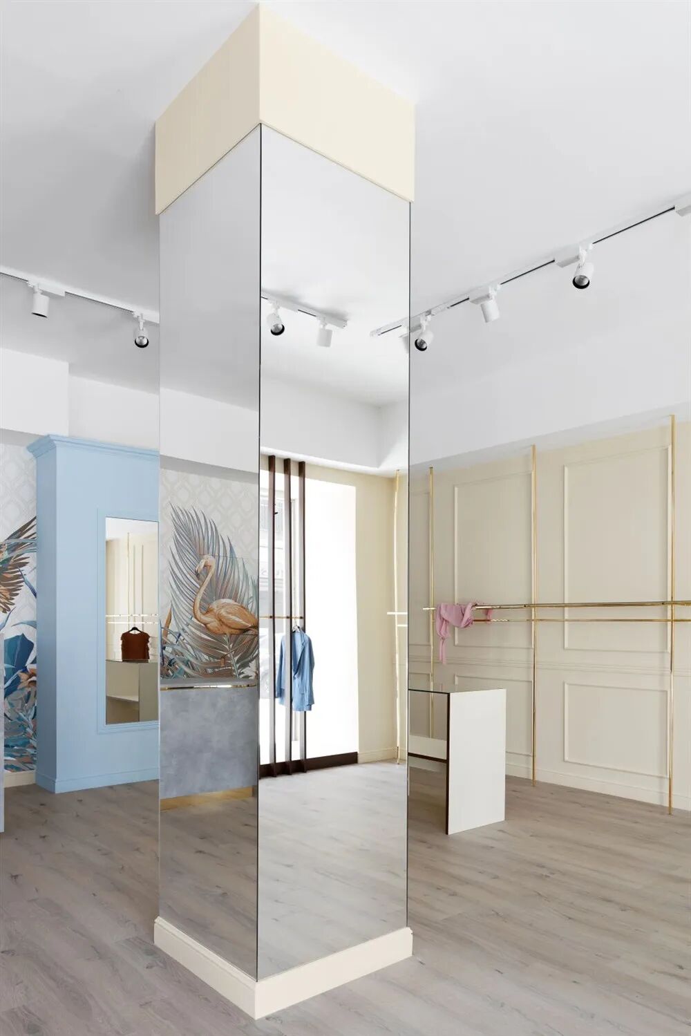 在店内,为设计师高级定制服装打造了一个独特的空间,该空间从其他展区中脱颖而出,由金色镀铬结构限定的全墙镶板为整个环境提供了亮度和装饰。这创造了一个非常小的剪影,灵感来自火烈鸟四肢的轻盈,这是收银台区域的壁纸的特点。