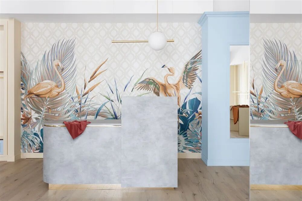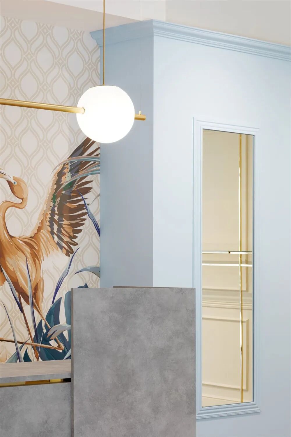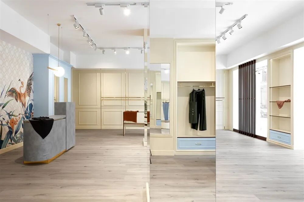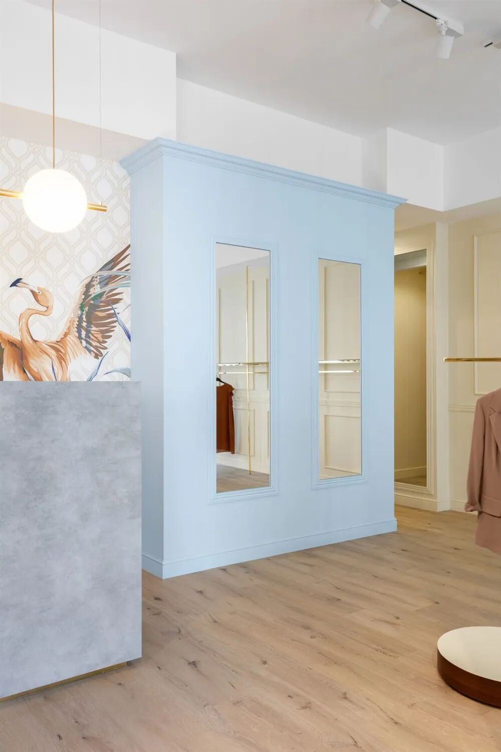 在店内,为设计师高级定制服装打造了一个独特的空间,该空间从其他展区中脱颖而出,由金色镀铬结构限定的全墙镶板为整个环境提供了亮度和装饰。这创造了一个非常小的剪影,灵感来自火烈鸟四肢的轻盈,这是收银台区域的壁纸的特点。
