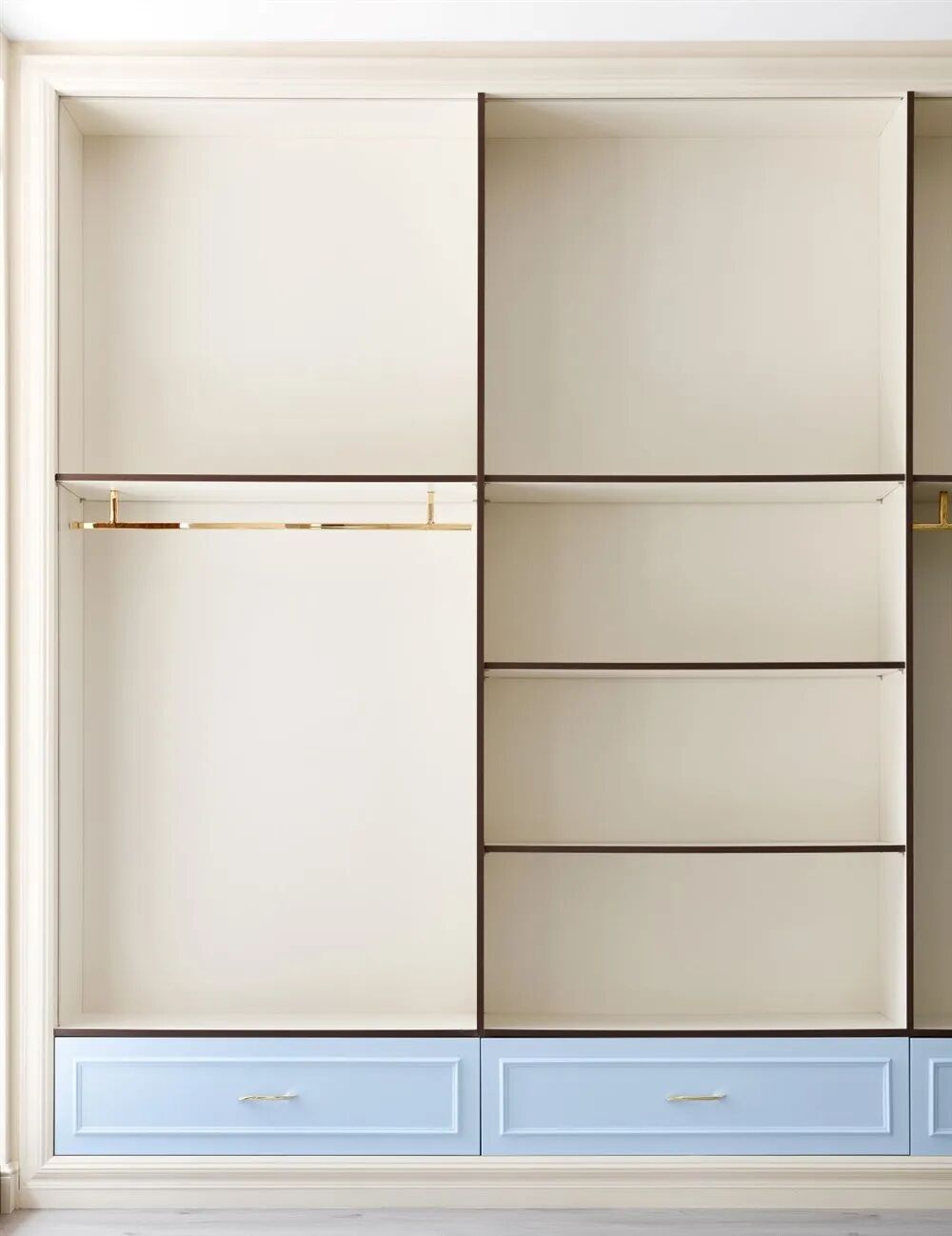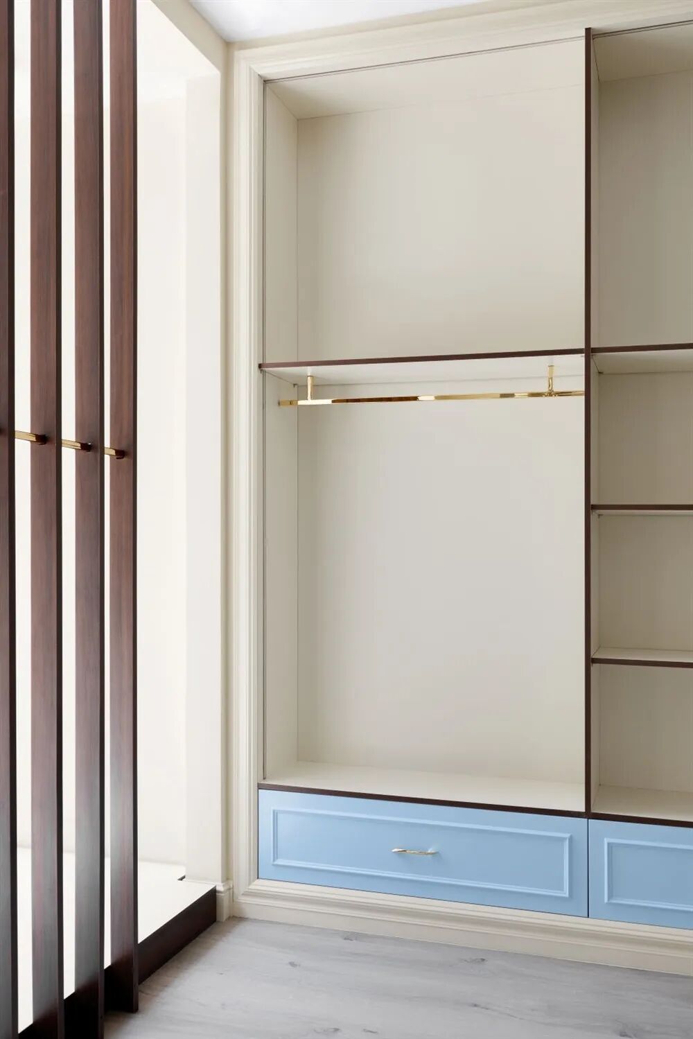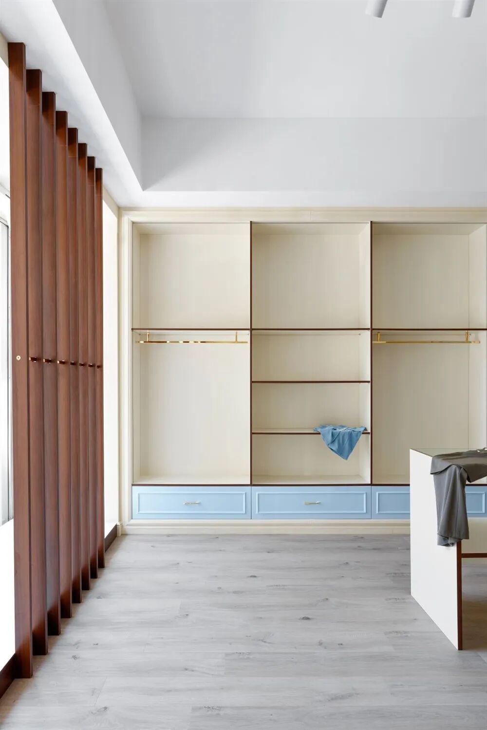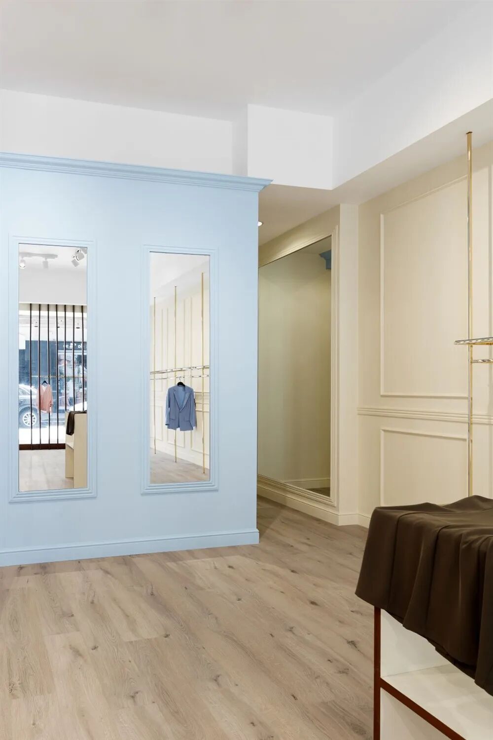 这种对色彩的研究源于在开放空间中创造秩序的愿望,也是对60年代设计的一种现代诠释,镀铬金色衣架和墙上的饰条突出了这一点。除此之外,还添加了另一种对比鲜明的图形交互作用,由暖色调的水平和垂直货架定义,边缘加入胡桃木精华,为环境提供了正确的构图严谨性。
