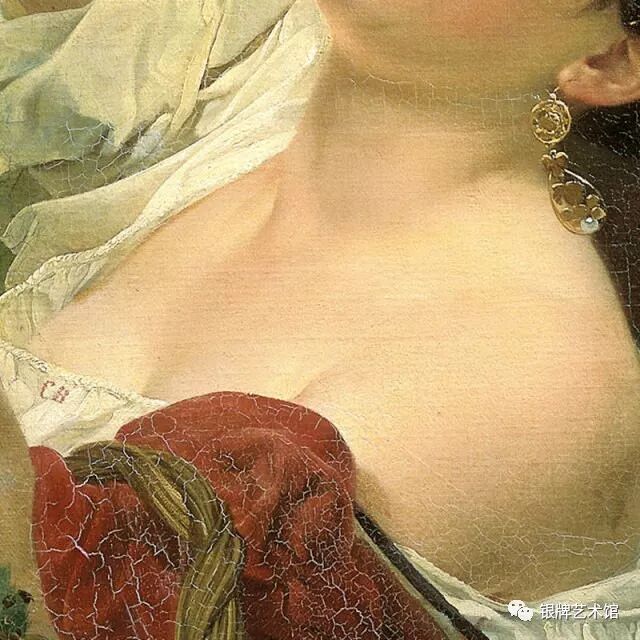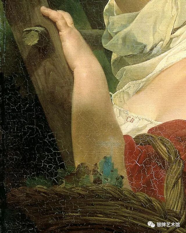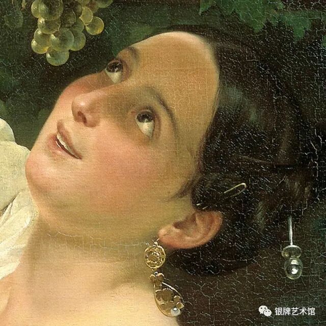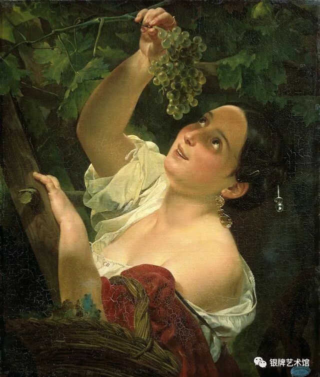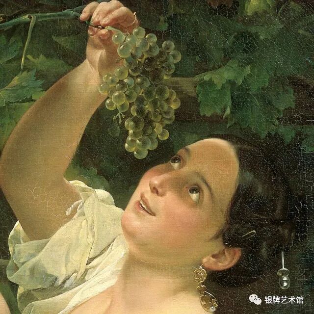 在这幅画中首次出现了画家喜爱的略带平民色彩的年轻美女形象,画中描绘了一个风韵十足、袒露丰满上身的女子正在采摘一串晶莹剔透的葡萄的情景。这女子已度过了青春花季,如日中天,仿佛成熟的葡萄。娇美的面部、浑圆而柔美的手臂与肩膀,增添了作品的魅力。