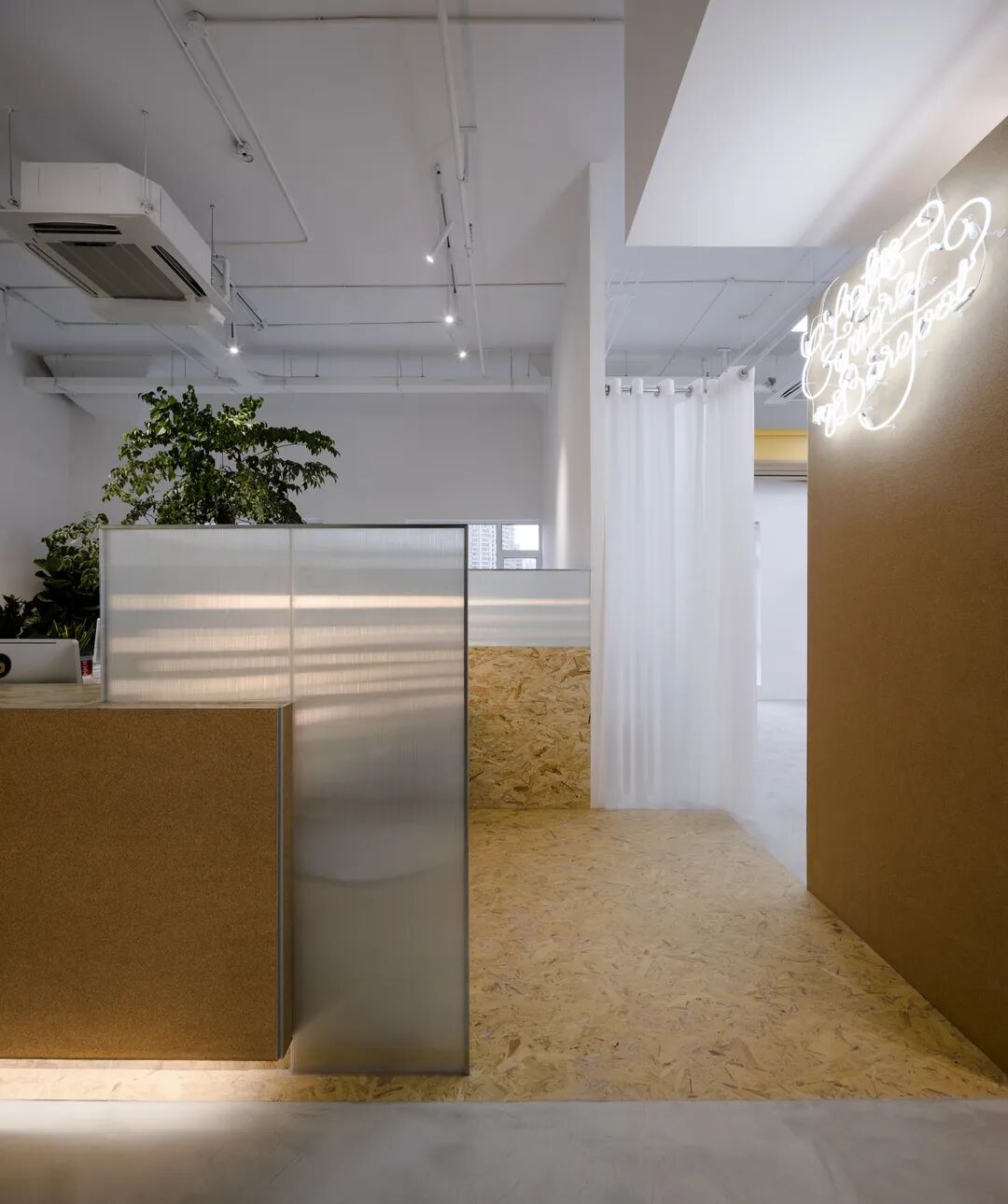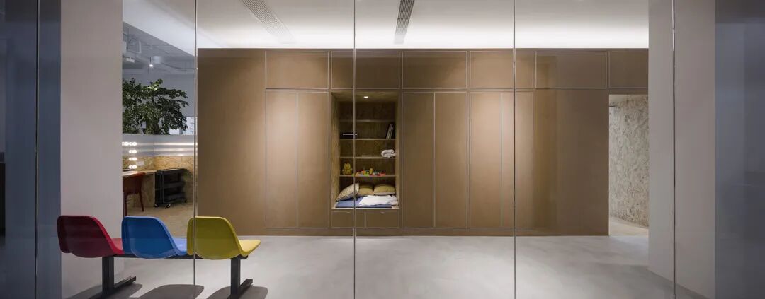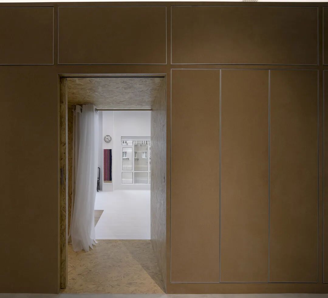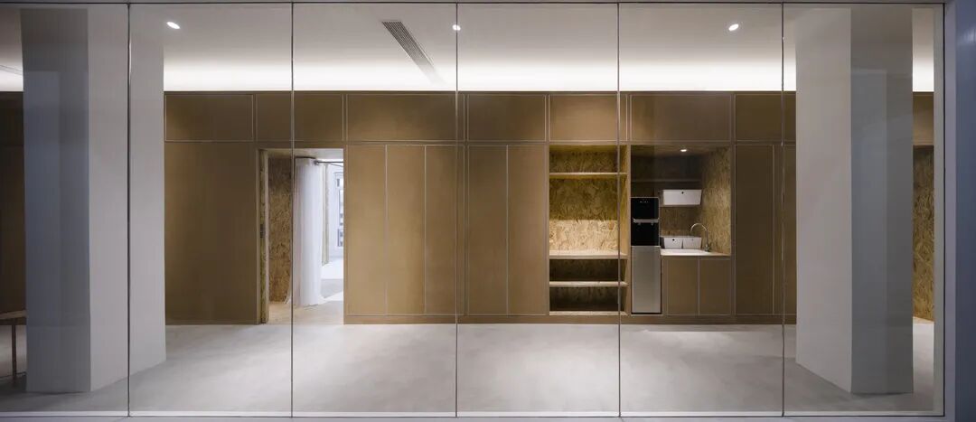 隐藏于单一的“玩具盒”中,所有的储藏需求都被吸收整合,所有的功能(包括接待台,办公室,化妆间,更衣室和茶水间)和流线都被组织起来:这既不是建筑也非家具,但同时又二者兼是。