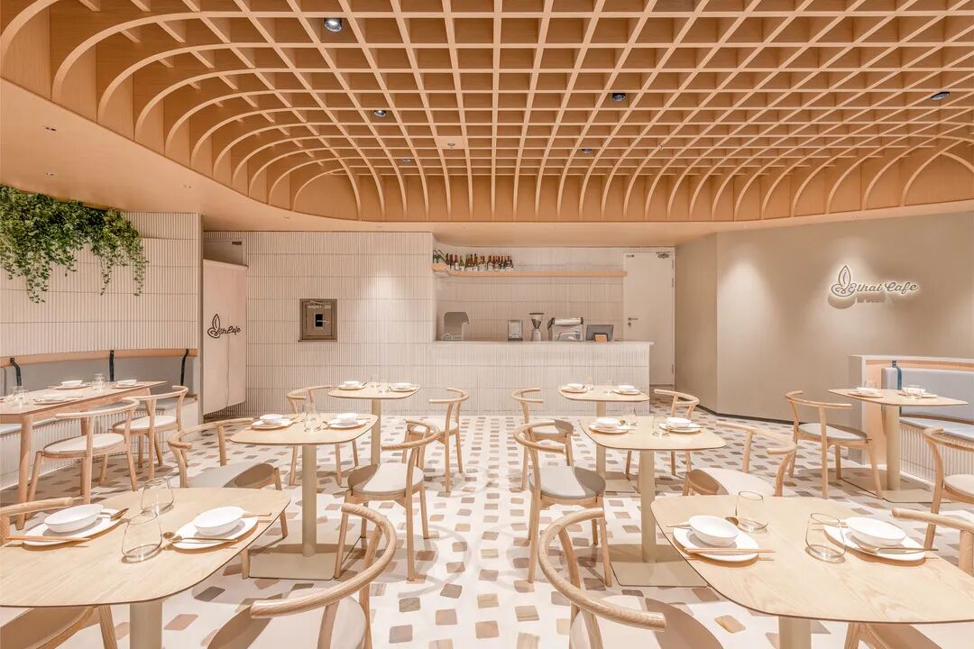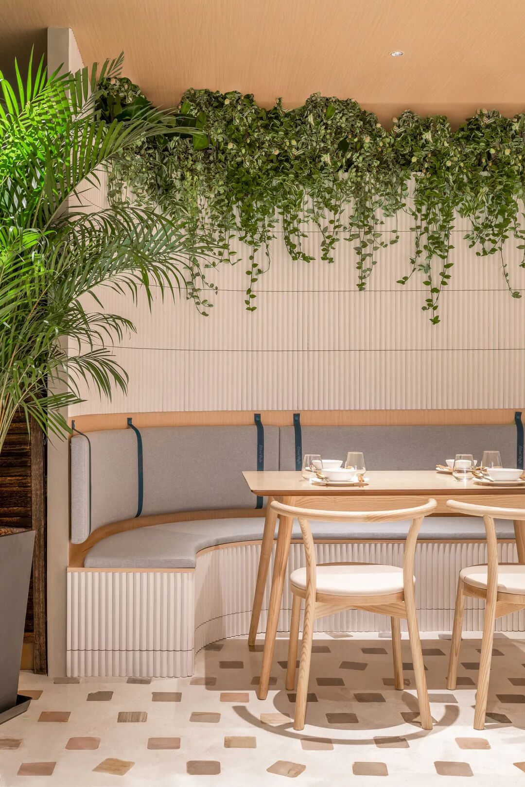 The material selection further enhances this idea of quiet sobriety by deploying a palette rich in earthy tones and alternating rough and smooth textures. Welcomed by the rammed earth gradient at the entrance, the customer then notes with interest the coarse terrazzo flooring that guides them into the space. Lifting further their eye-level, they will discover a rich texture on the vertical surfaces, covered by white arched tiles. Simultaneously, the environment feels natural from the wooden surfaces on the furniture and the grid ceiling, as well as the vegetation. Finally, pieces of artwork constitute different focal points of the restaurant, bringing a traditional Thai touch and finalizing the integrality of Ethai Café.