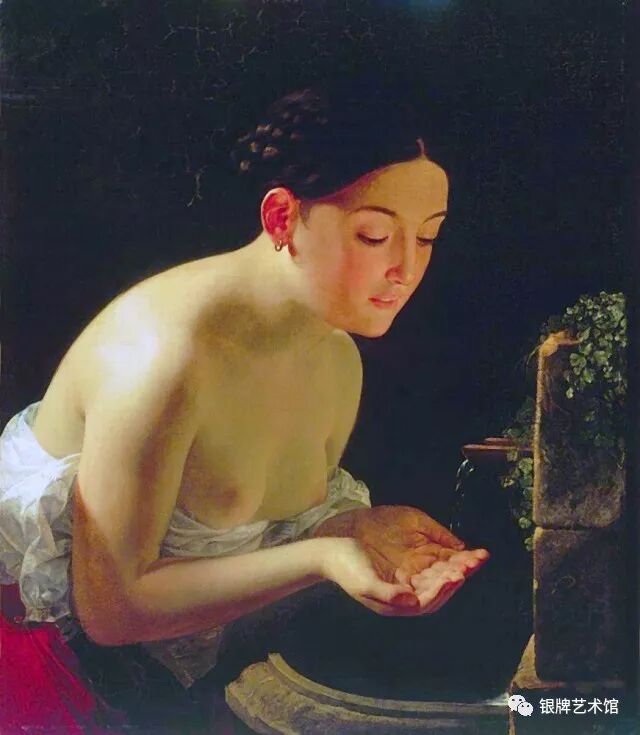 《意大利早晨》描绘了一位在喷泉的细流下盥洗的年轻女子,她的仪态优雅恬静,精致的面容被柔和的晨光照亮,美不胜收。画中保存着浪漫主义肖像画的激昂,充满了明亮的色调。