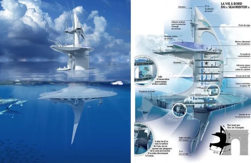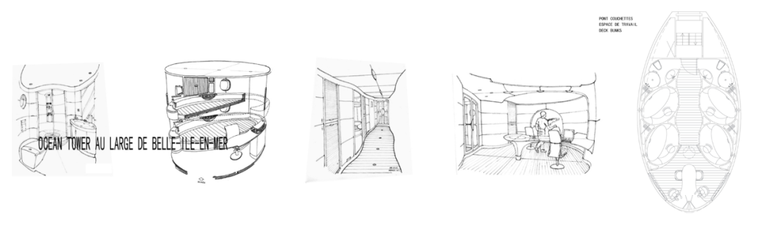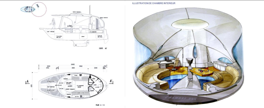 同样,下面这个项目是我2003年做的。我的老师JACQUES ROGERIE是法国军方御用设计师,这个项目类似中国的蛟龙号,用做很多海底科考的项目。我们做了一个海底飞行器,供16位科学家每次科考出海大概持续3个月时间。所以我思考这个空间一定要特别紧凑,该放松的时候可以放松,因为三个月出海科考是非常艰巨的。这个建筑是潜入水中,完全垂直的建筑,在海面上漂浮游动的概念。整个空间是用垂直建筑的方式,充分地考虑到这三个月份中人和空间和自然的关系。