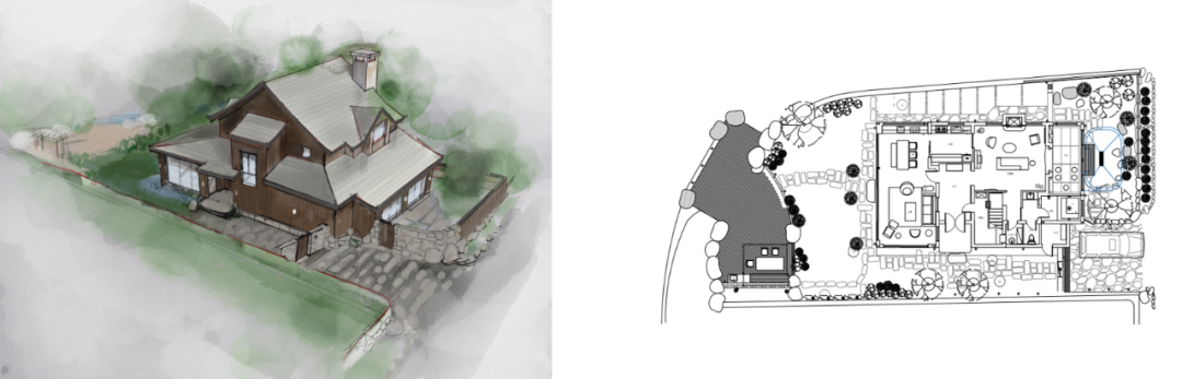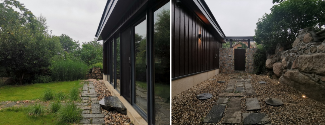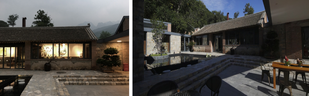 我在里面买了一套特别小的房子作为周末度假的房子,这就是我的房子,这是多年以前拍的。我们把它做得很朴素,朴素到回归自然的状态,所有的材料等等都是当地土建的工人做的,施工也是他们做的。可能这个做工上不怎么样,但在这个空间中,我解决了自然智慧的问题,或者说是“风水”的问题。由于受西北风的影响,原来入口是从这个地方进去,这有一个通道,西北风吹过来树叶直接往里面扫,这个地方的温度和室内空间温度会相差3度左右。而我把入口改到北侧,室内空间整个就乾坤大挪移了。而且本来它是一个美式的空间建筑聚落,这样挪改把它改成了偏东方的调性,但是没有违和感。