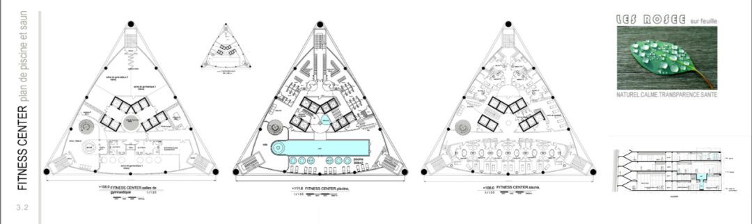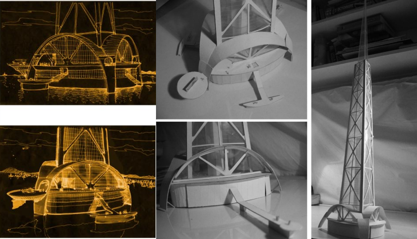 这个项目是我二十几岁在法国留学做的一个建筑,在英吉利海峡废弃的石油钻井平台上,做了一个摩天大楼,思考的问题是关于和季风与洋流的关系,所以做成了三角形的建筑,这是非常原野性质的自然,让自然来帮我做设计。内部的空间也完全是三角形,用一片树叶和露珠的概念来展开内部空间。这是内部空间的设计,也来源于树干的灵感设计。
