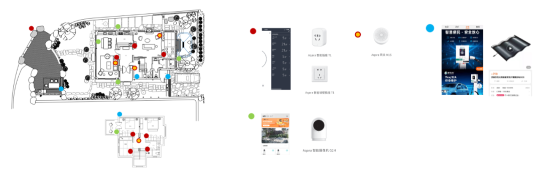 这是智能家居的部分,我对智能家居还是蛮挑剔的,用的是Aqara绿米的。红点的部分是插座,也有摄像头,今天我所看到的雪景就是摄像头拍摄。这个项目在我没有改造之前,用7个面板就营造了智能环境。包括花园的浇水,就是用两个摄像头看着,有几个插座面板来控制它是否浇水。我自己本身是自然主义者,对智能家居觉得不会为了智能而智能。我很早就关注智能,人性化这一点在智能家居中特别重要,同理心非常重要。