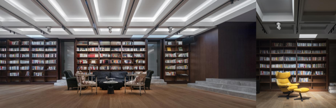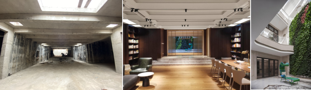 当时挖的时候一定要有光,地下室是一定都是有光的。因为我觉得中国人之所以有所谓的风水的概念,他的本质就是阳光、空气流。这个空间最后呈现是这样的(如图示),还做了一个图书馆,现在放了几万册的书可能还不够。