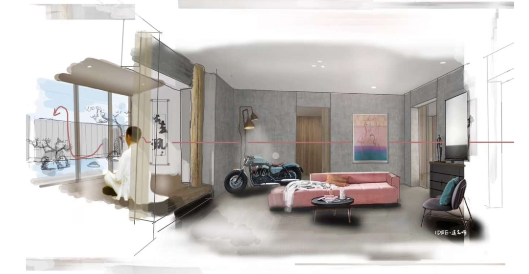 这是室内空间,平时可以在这里打坐。看效果图就可以看出来我平时打坐也静不下心来,但这个社会太“嘈杂”了,而我所追求的就是关于安静、自然、朴素、善意、惬意等等。我所思考的,是所有空间和人的关系,空间和风的关系,空间和阳光的关系。包括对园林的改造:哪些地方不种草,哪些地方要种草,园林植被起伏和室内的关系等等,都是要思考的一些点。