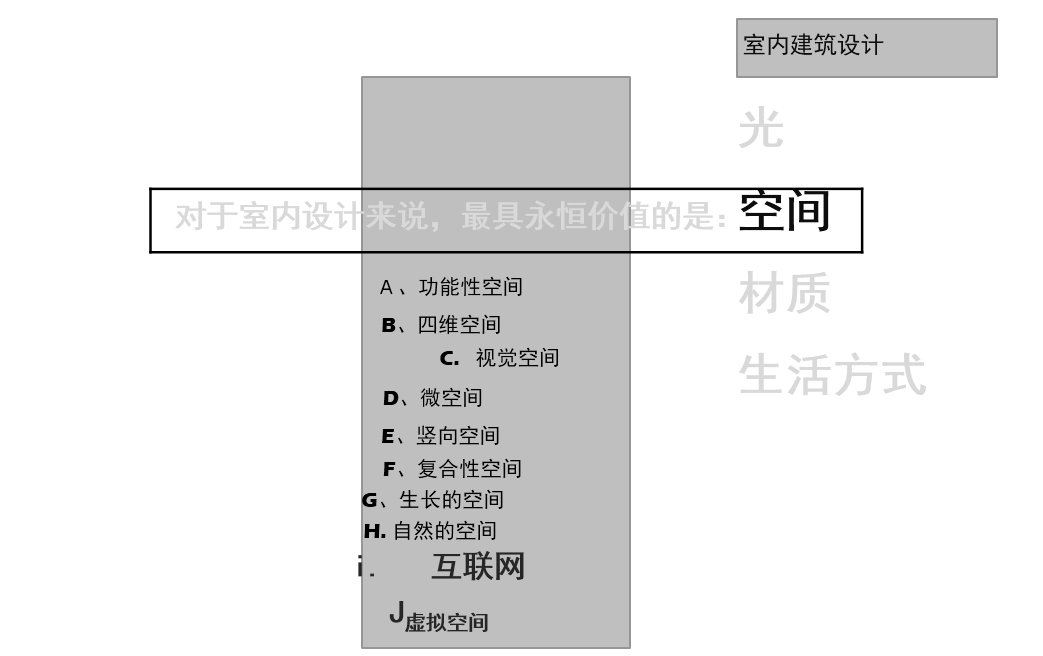 两千五百年的中国自然智慧,在人居上带给我们的空间,可以量化为这些内容。我认为当下的空间设计和以前室内设计区别在于,现在的设计是“无”的部分,相当于哲学中的“空”。而这个“空”具体呈现是这样的内容。