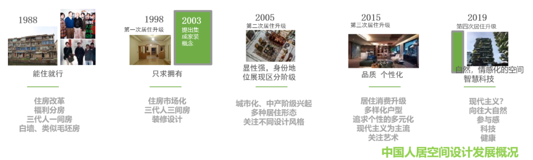 中国人居空间的发展经历了这么几个阶段(见图),因为我是19岁从事设计这个行业,工作了多年以后去法国上学, 2003年在留学期间,我受到现代主义的影响提出来了“零风格化”的集成家居。老百姓家装系统随着每次的居住升级,到2015年时,其实现代主义的空间形式已经开始大量在中国地产与家居中出现。而最近的一次,第四次人居环境的提升,我认为是在自然、情感化的空间以及智慧科技的认知提升上。