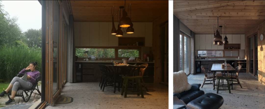 这是朝东的房子,原来餐桌不在这个位置,我喜欢早上吃早餐的时候,有阳光打在餐桌上,夏天不热的时候我和夫人可以坐在外面看书,这完全是自然的感受。如果处理不好,这里是坐不住人的,是形成不了这样的空间。