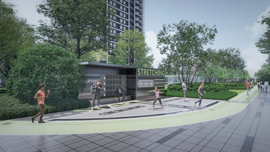 关注跑步的健康,在跑道的起点以及中途位置,设置起跑区与能量补给站,在跑步的开始、中途与结束时,得到热身、临时休憩以及拉伸等促进健康跑的步骤,同时放置储物柜以及休憩坐凳等配套设施,跑步更健康更便捷。