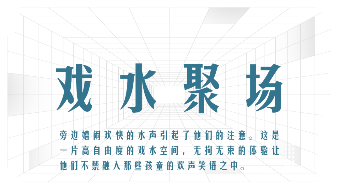 戏水聚场主体是可观可玩的戏水活力广场,“撒欢”“自由”“轻松”充斥了整个场地,“摸鱼”“划水”“躺平”是场地中最明晰的三大功能空间,场地主张惬意自由的林下体验状态,同时也可作为观赏型水景,在同一个场景展现不同的景观感受。