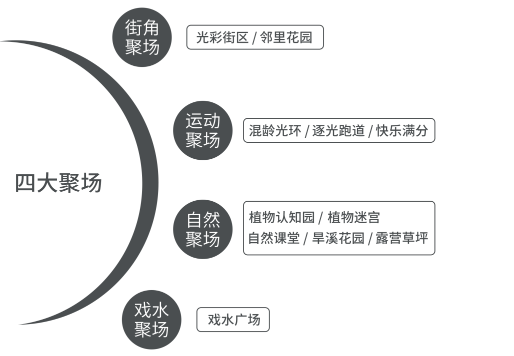 光年宇宙是无数个聚光场组成的集合体,而街角聚场、戏水聚场、自然聚场及运动聚场是针对住区内外景观场景的描摹。