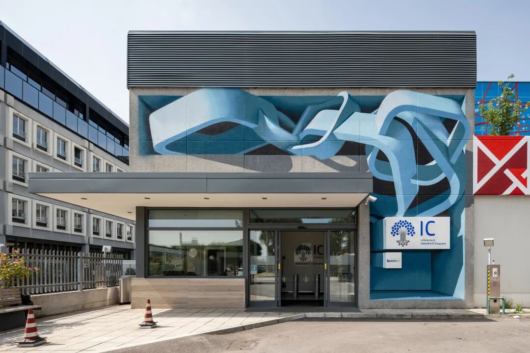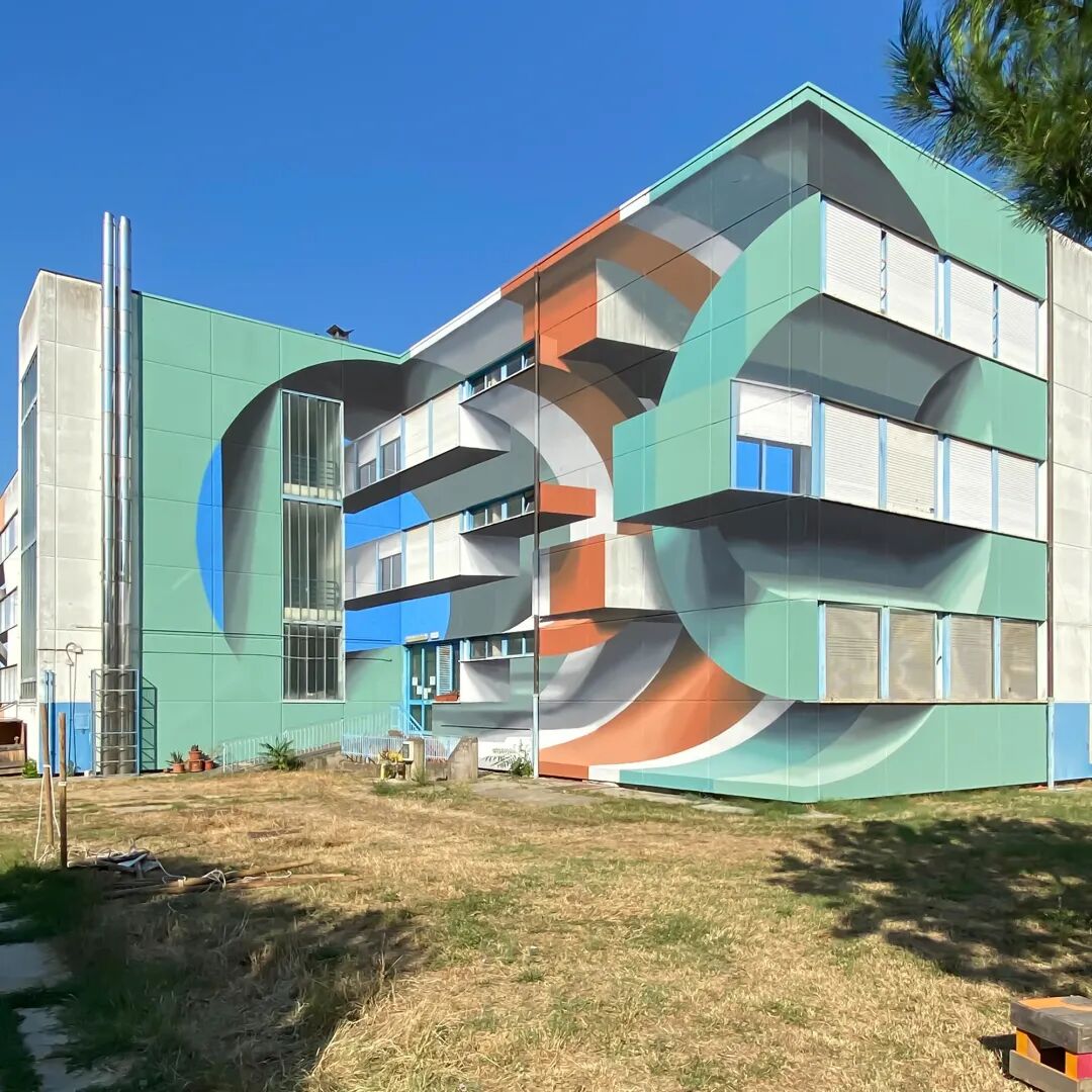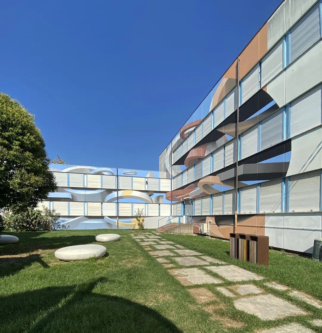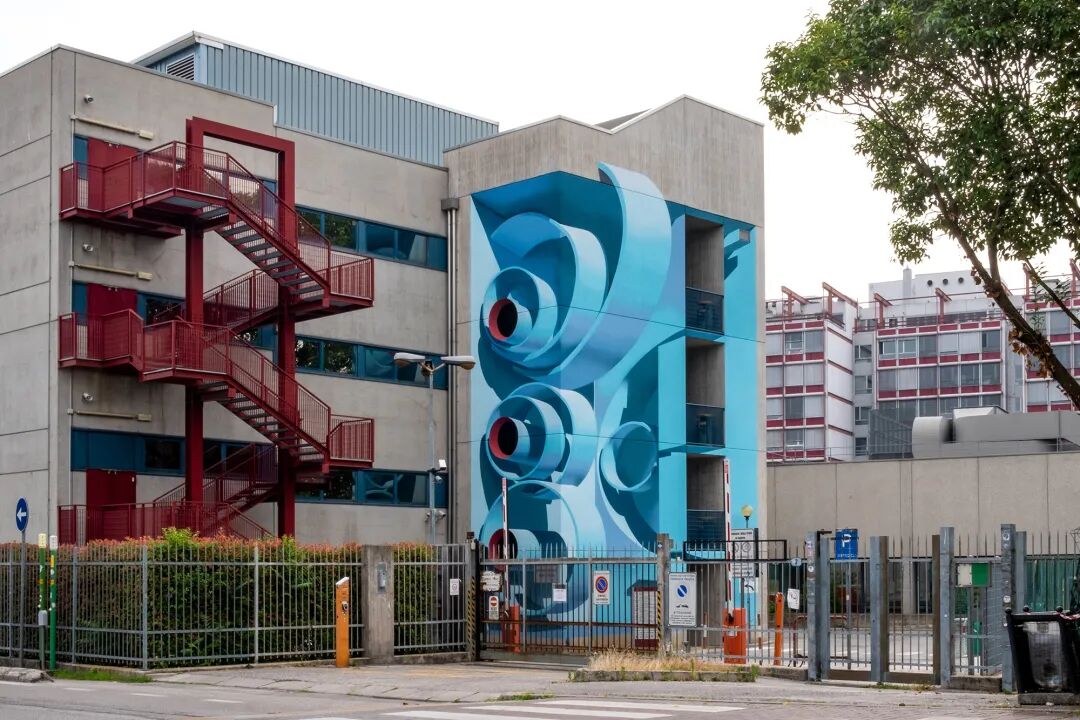他的作品中有大量的弯曲线条,以及几何色块的分割,一眼望去,这些色块似乎从墙面上直接跳脱出来,当观众的视角发生变化时,这些图案呈现出的视觉效果也会发生变化。一整面墙,被这位艺术家画成了真正的裸眼3D,让人在感到惊讶的同时,也不得不佩服艺术家的想象力和创造力。