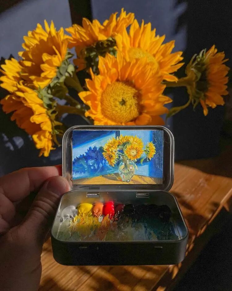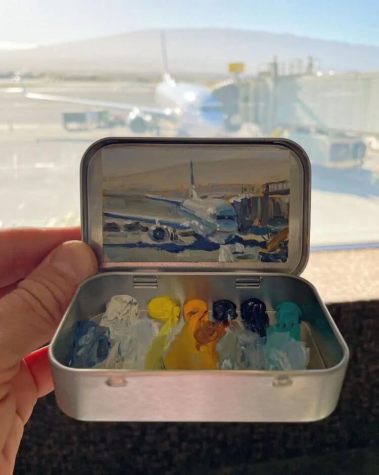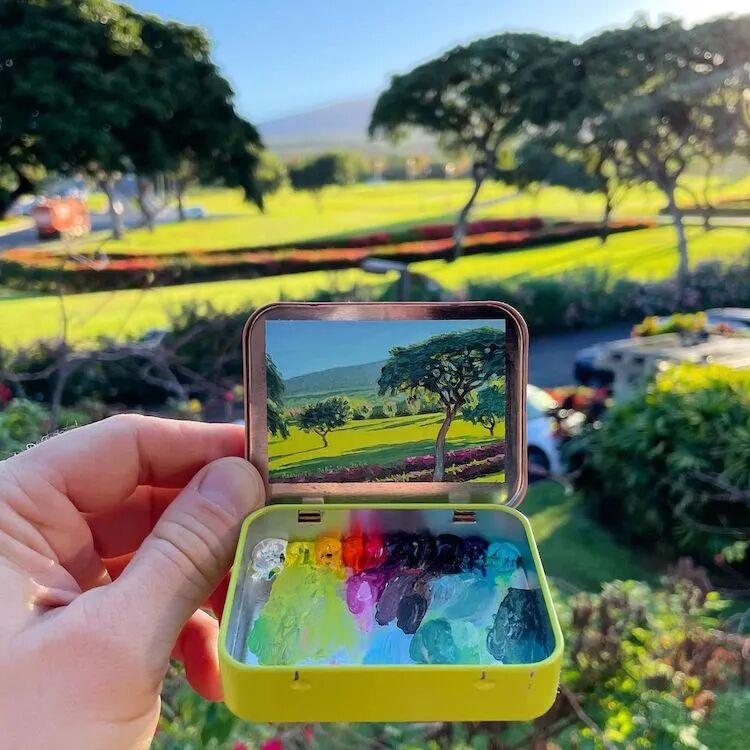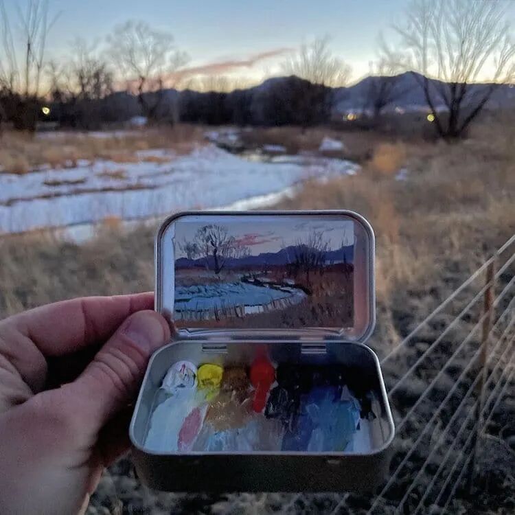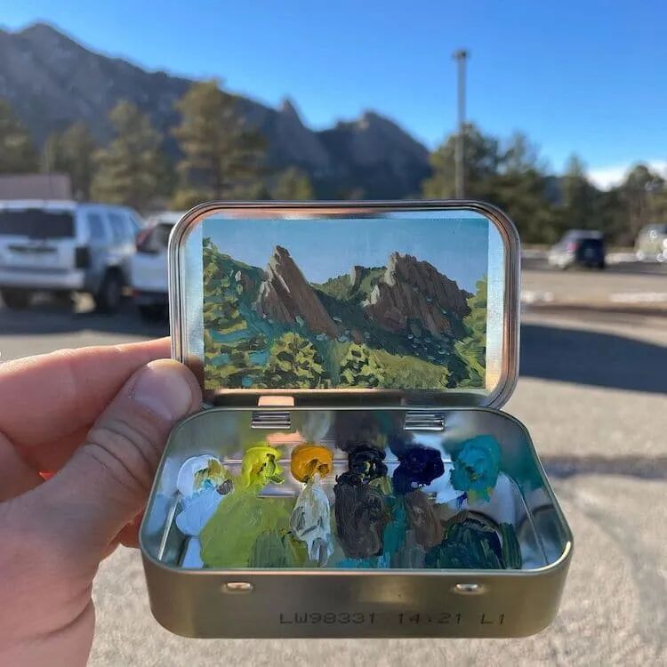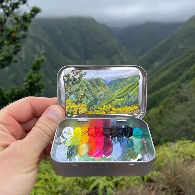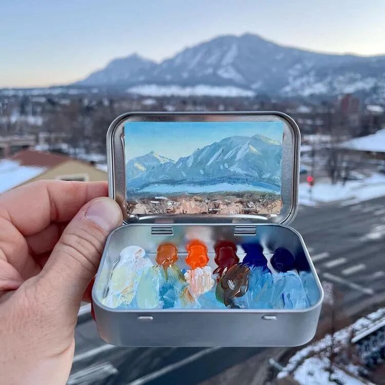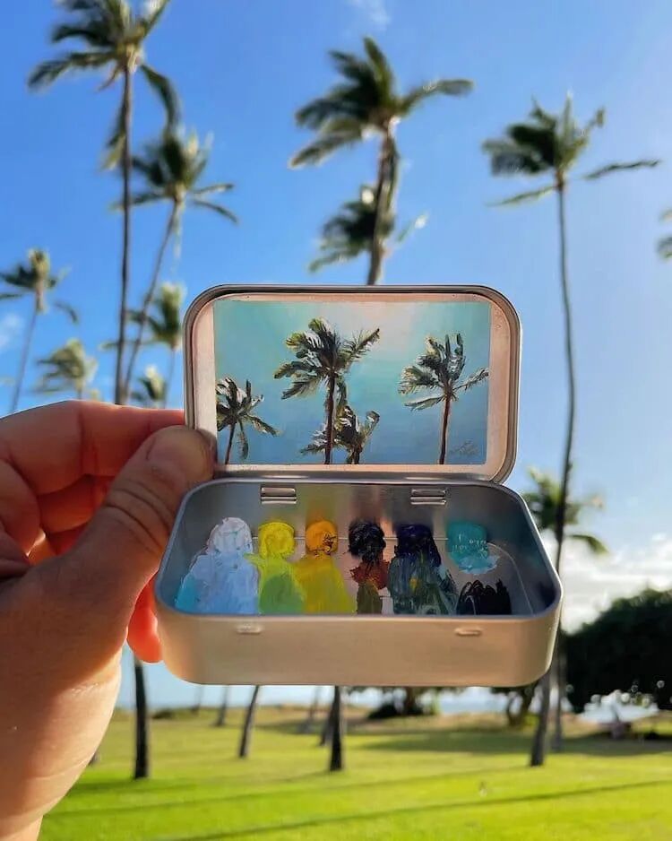这些小盒子里好像藏着一个艺术馆,每一个盒子的里面,都有一幅微型油画作品,风景、人物、建筑景观......各种主题的画作应有尽有。别的艺术家出门写生都会带上速写本,但是这位艺术家每次出门,兜里都会揣几个铁盒子,盒子深的一边被他当成调色盘,浅的一边则被当做画布。