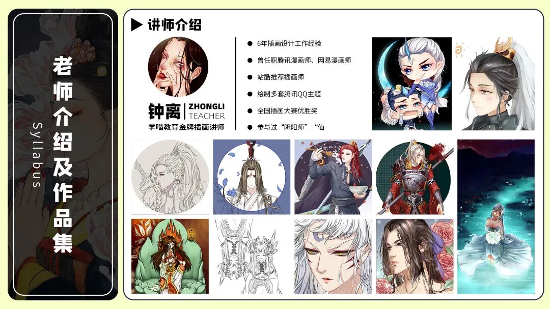 钟离老师主攻国潮插画,也对儿插、扁平风插画多有涉猎。插画项目实战经验丰富,曾参与了游戏大IP《阴阳师》插画项目的创作,具备多年在线教育经验,相信你能在这里有所收获。