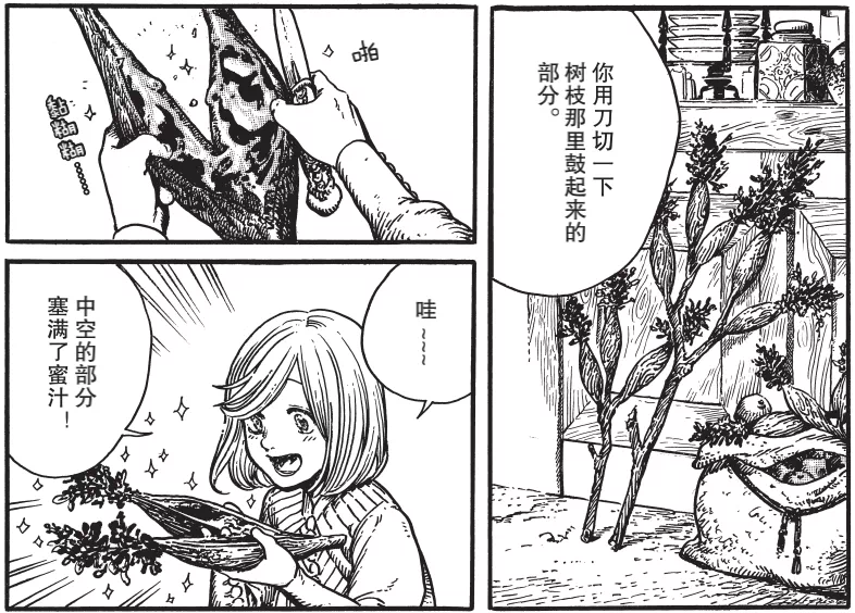 把树枝膨胀起来的地方割开,里面就会流出蜜汁。这种蜜是做点心和酿酒的原材料。