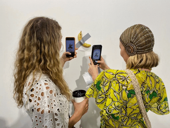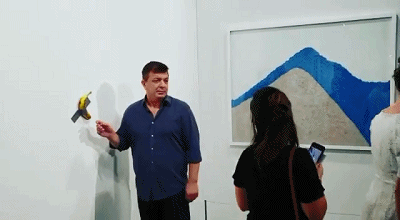 这件作品被命名为《喜剧演员》,共有三版。分别以12万美元和15万美元的价格成交,但更精彩的是,在展会上,第三件被一位行为艺术家当场吃掉了。