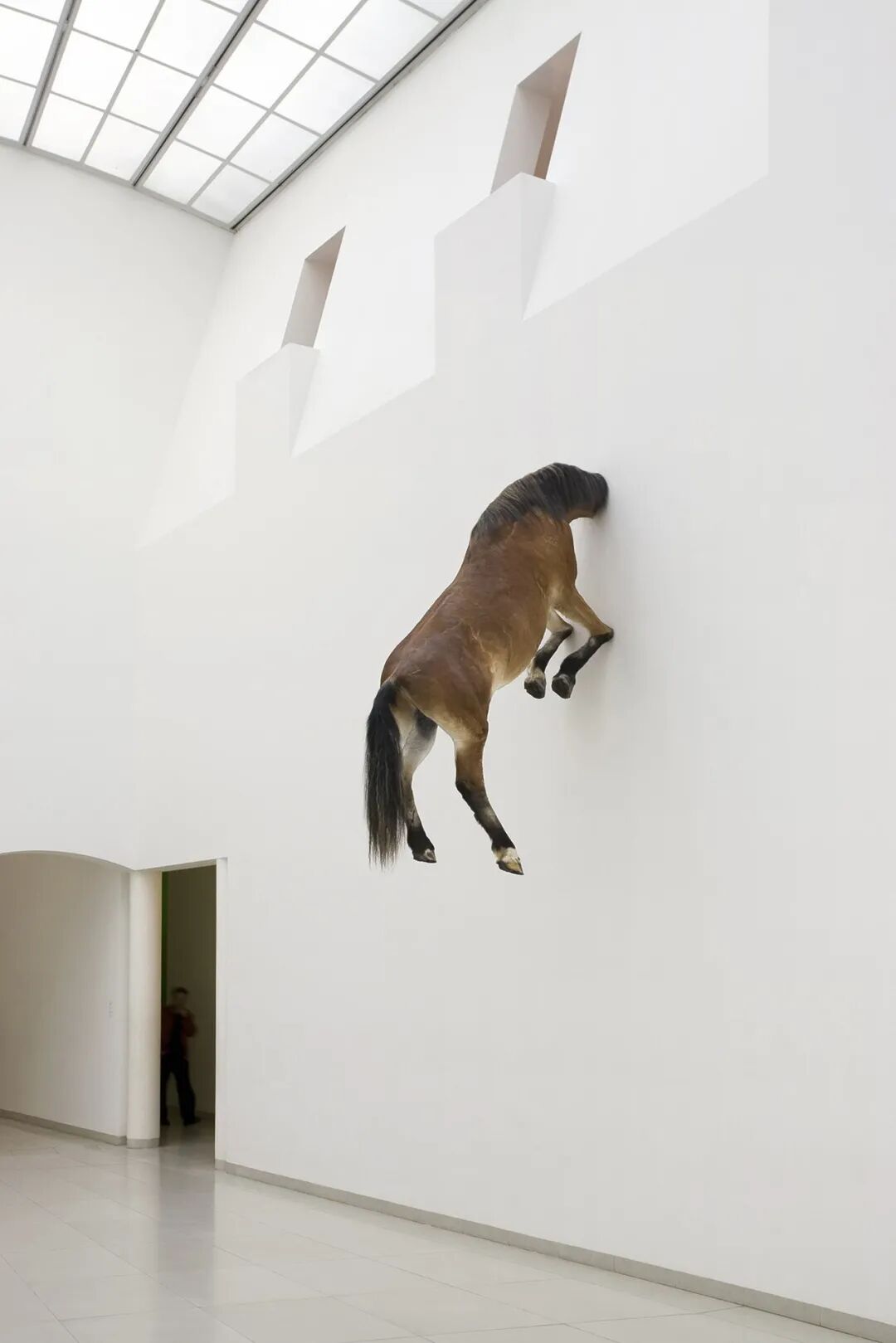 《无题》中,一匹马一头栽进墙里,只留身体部分显露在外,看不见马的头。用马作为反英雄的战利品,把它困在了美术馆的墙上。