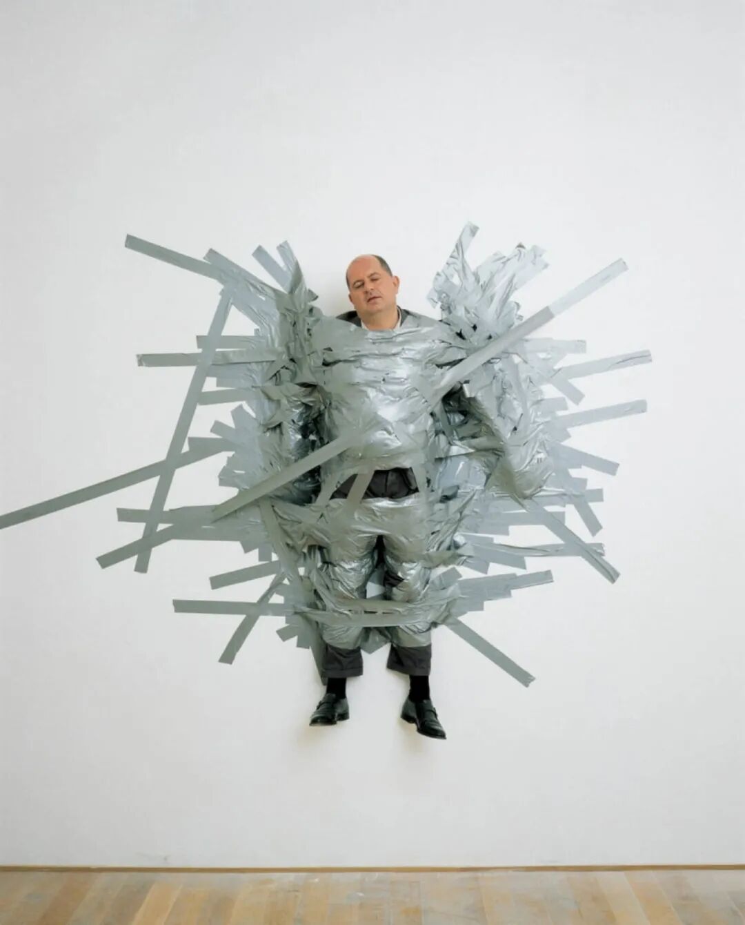 曾用胶带把画廊老板捆粘在墙上做展览,这件“艺术品”被命名为《完美的一天》。