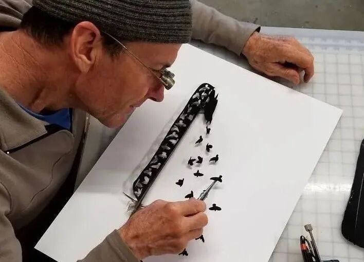 一把剪刀,一根羽毛,克里斯·梅纳德小心翼翼地剪出了群鸟、人物、小星星等精美的轮廓。由于可操作的空间太小,艺术家在进行创作时,往往需要在镊子和放大镜的辅助下才能完成。制作剪贴羽毛画作,用到的鸟类羽毛大多来自椋鸟、麻雀、孔雀、鹦鹉和野鸡。