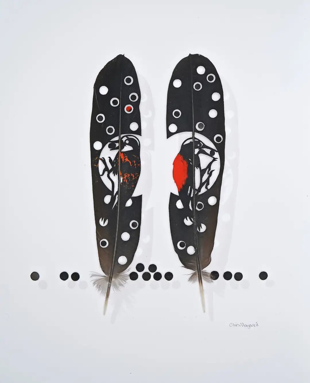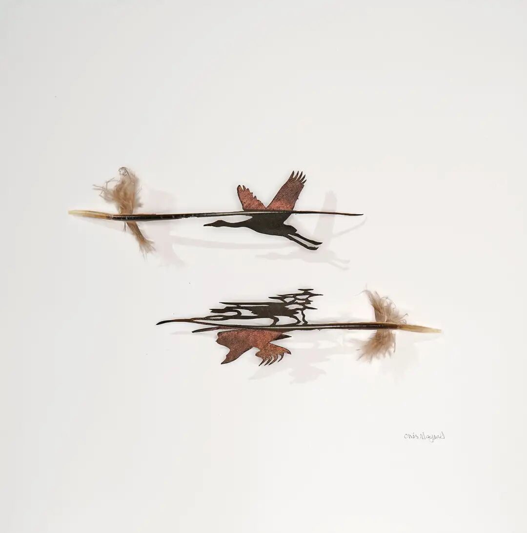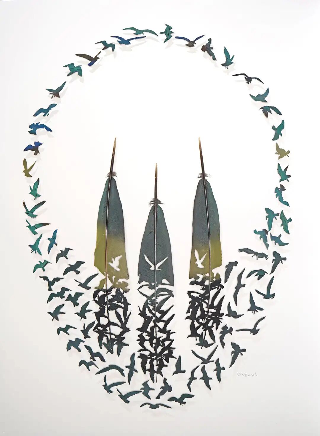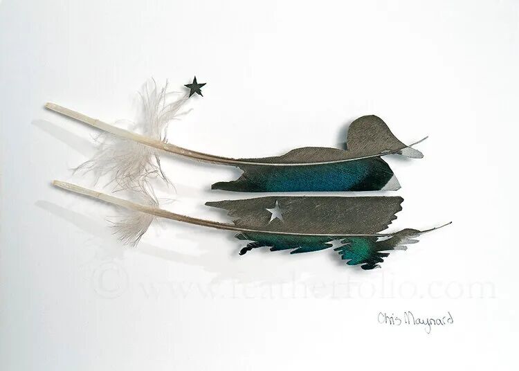 这些作品都是艺术家克里斯·梅纳德用一把剪刀,在羽毛上裁剪出的画作。他的作品并不需要添加任何颜色,因为羽毛原本的色彩就足够鲜艳明亮,从表面看,他创作的就是一些小小微型工艺品,不过对艺术家而言则是一种生活方式:“我的羽毛工作给了我一个满意的空间,让我可以从中观察世界。”