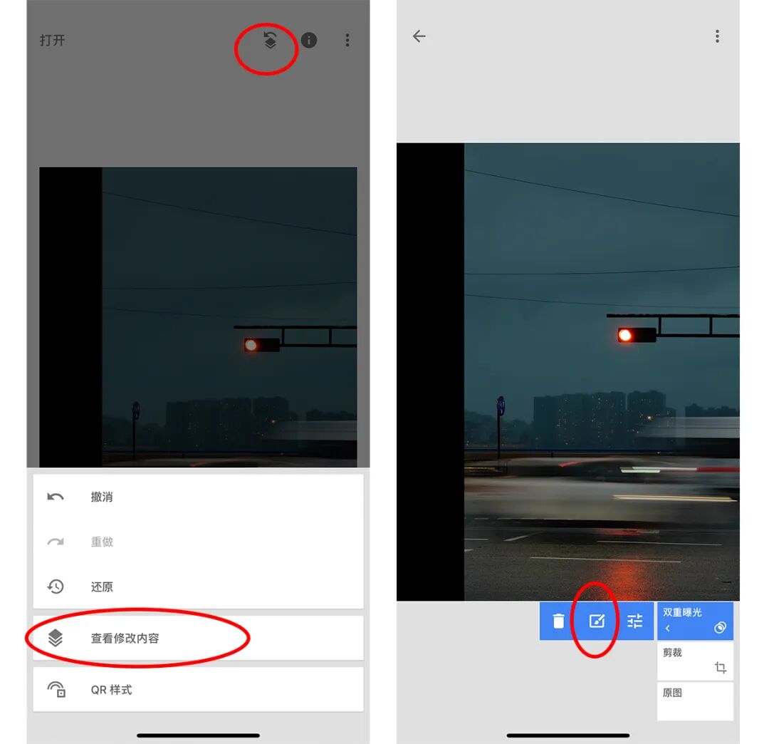 在snapseed主界面,点击右上方第3个箭头按钮,查看修改内容,再点双重曝光,再点中间的按钮,即可进入蒙版操作界面:
