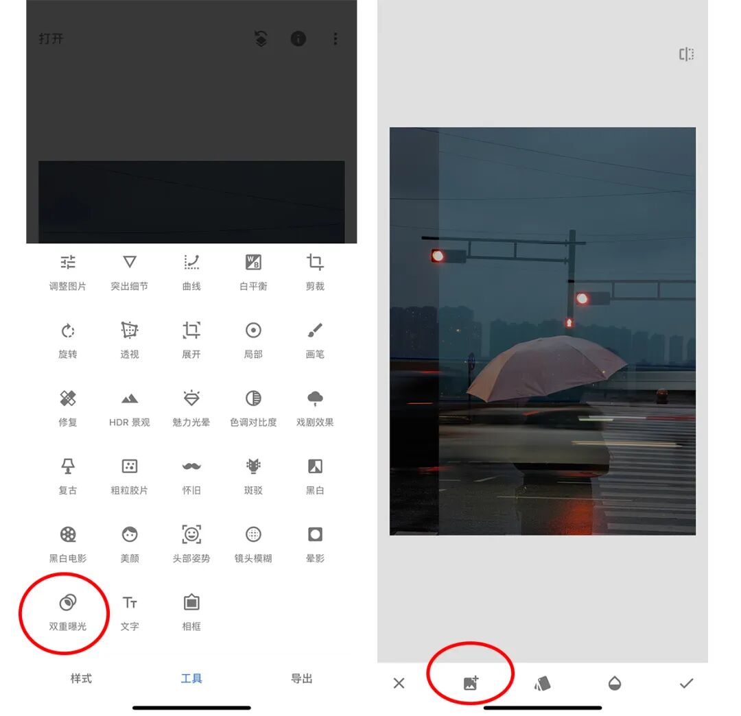 进入软件snapseed,首先打开人物照片,点击工具栏中的倒数第3个工具【双重曝光】,添加照片;