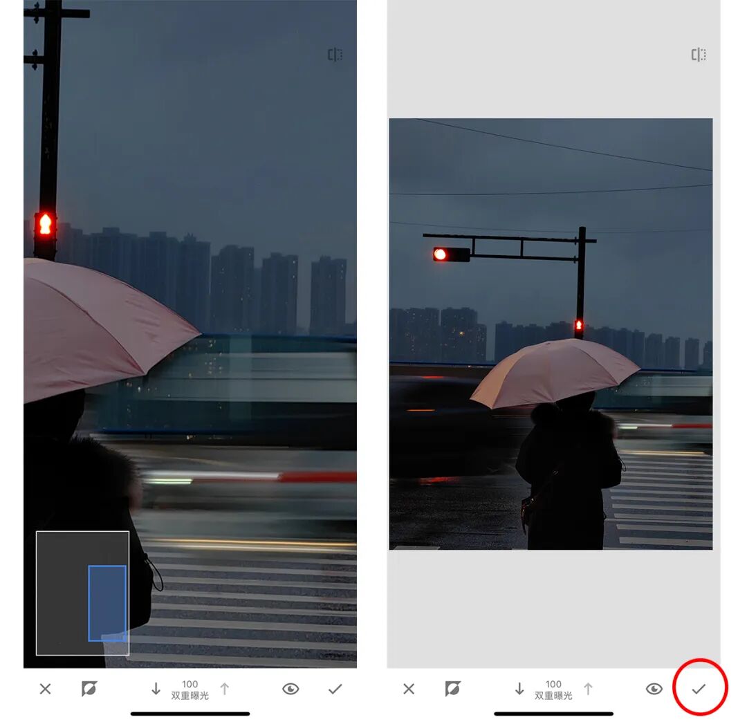 涂抹完成就可以点击对勾,返回主页面,车轨的合成就完成了,然后再适当调色,就得到了最终的氛围感十足的街头照片。