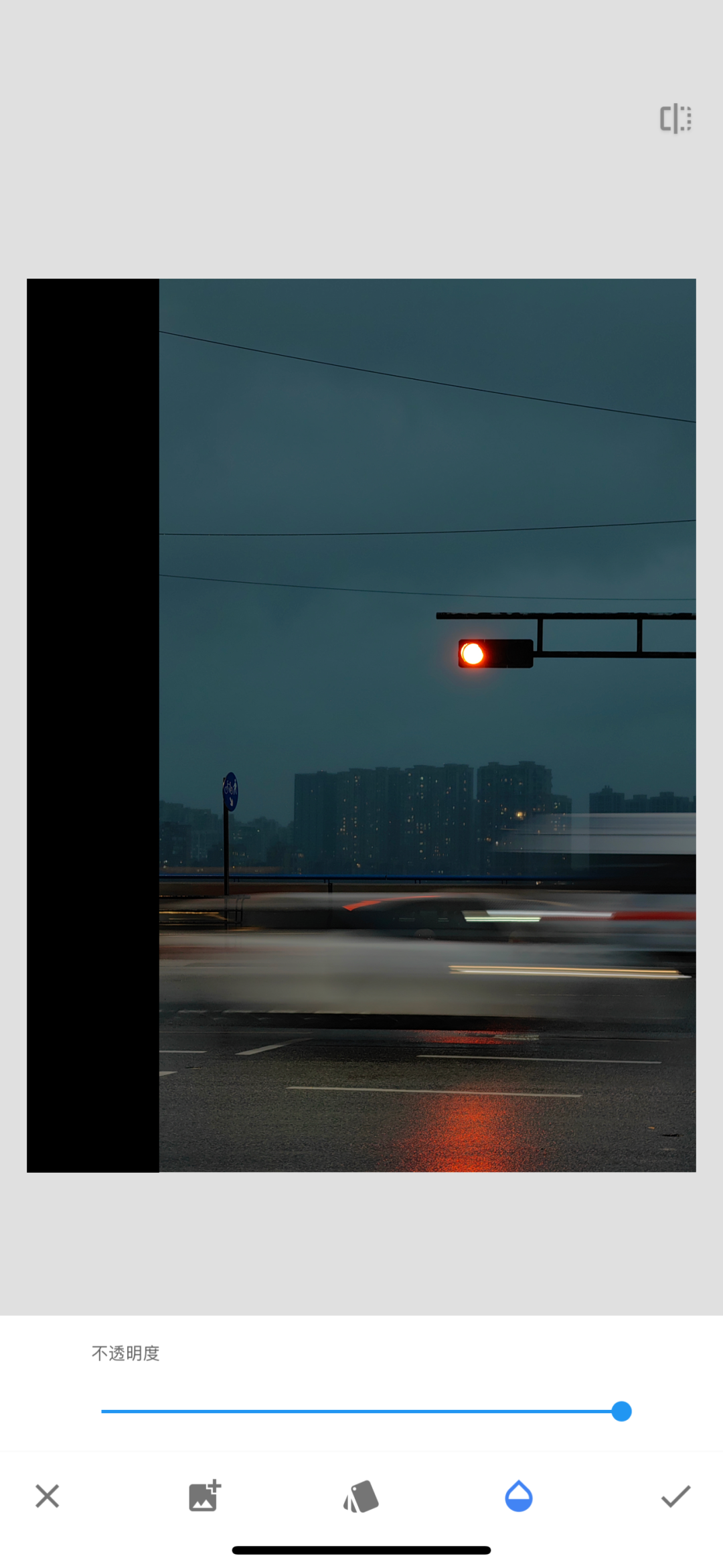 导入另一张车轨照片后,把车轨照片的位置适当往右边移动,让车轨刚好在人物右边的区域:之后,再点击底部第3个按钮,把不透明度拉到最右边,再点击对勾: