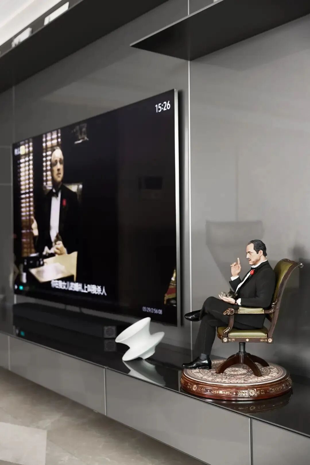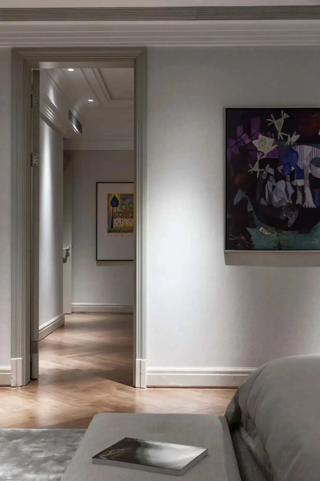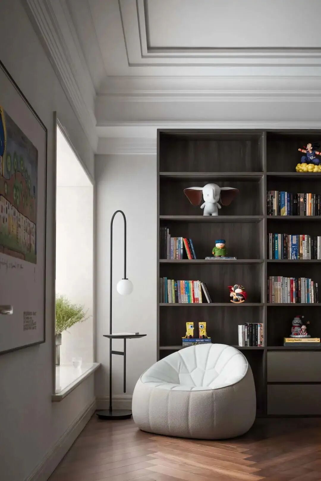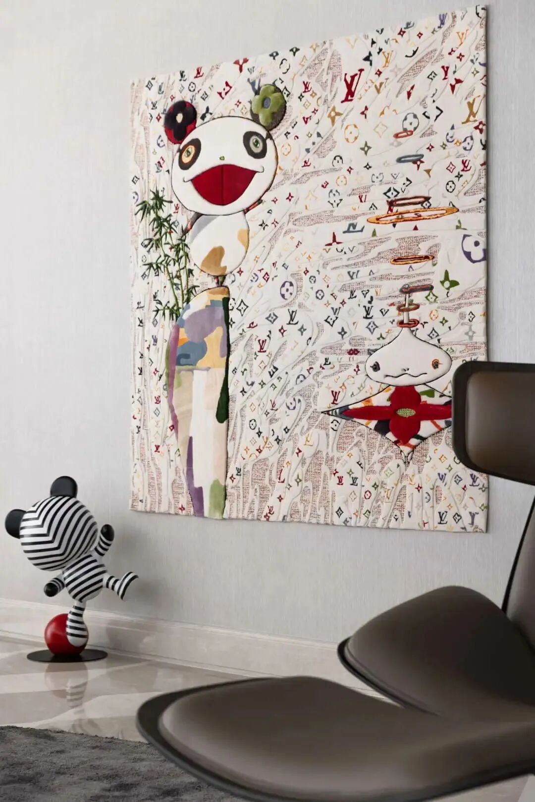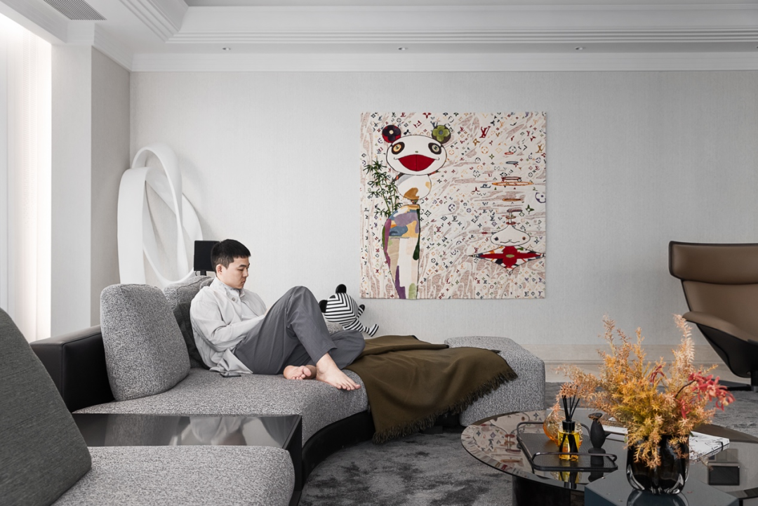 村上隆和LV联名的画作,为了使颜色饱和度不被破坏,用定制挂毯的形式去呈现,这一艺术元素与整个客厅的秩序感、理性精神形成鲜明的对比碰撞,却也是凡凡酷酷性格里可爱的一面。