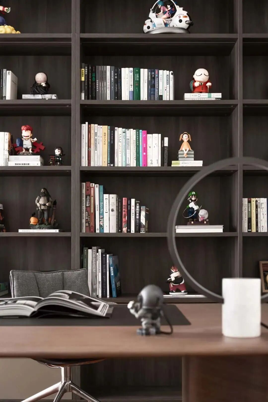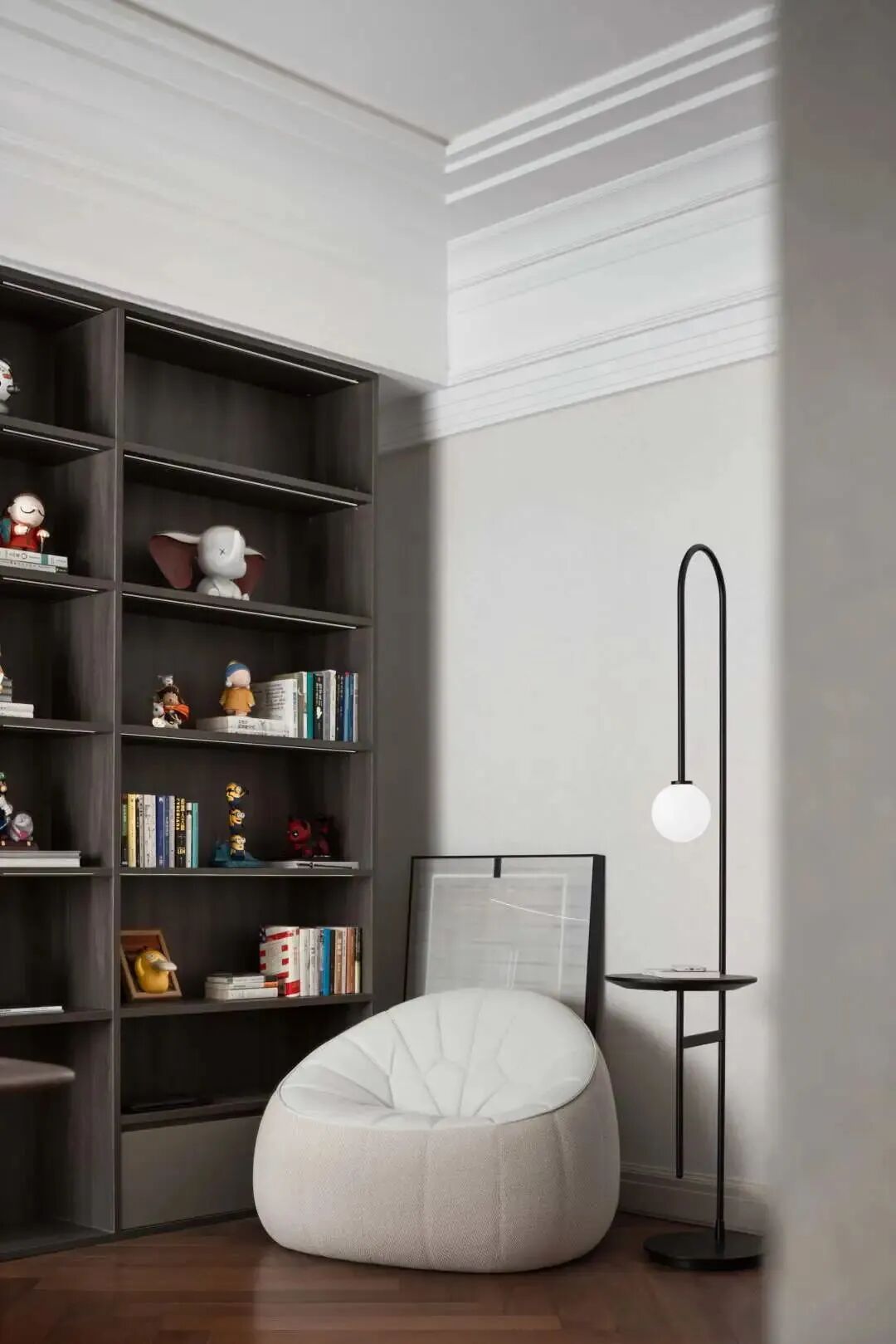 书房的落地台灯来自品牌Livingdivani,可以当茶几放置书本与茶杯,无线充电的功能更加便捷、富有科技感,符合当代年轻人的生活方式。
