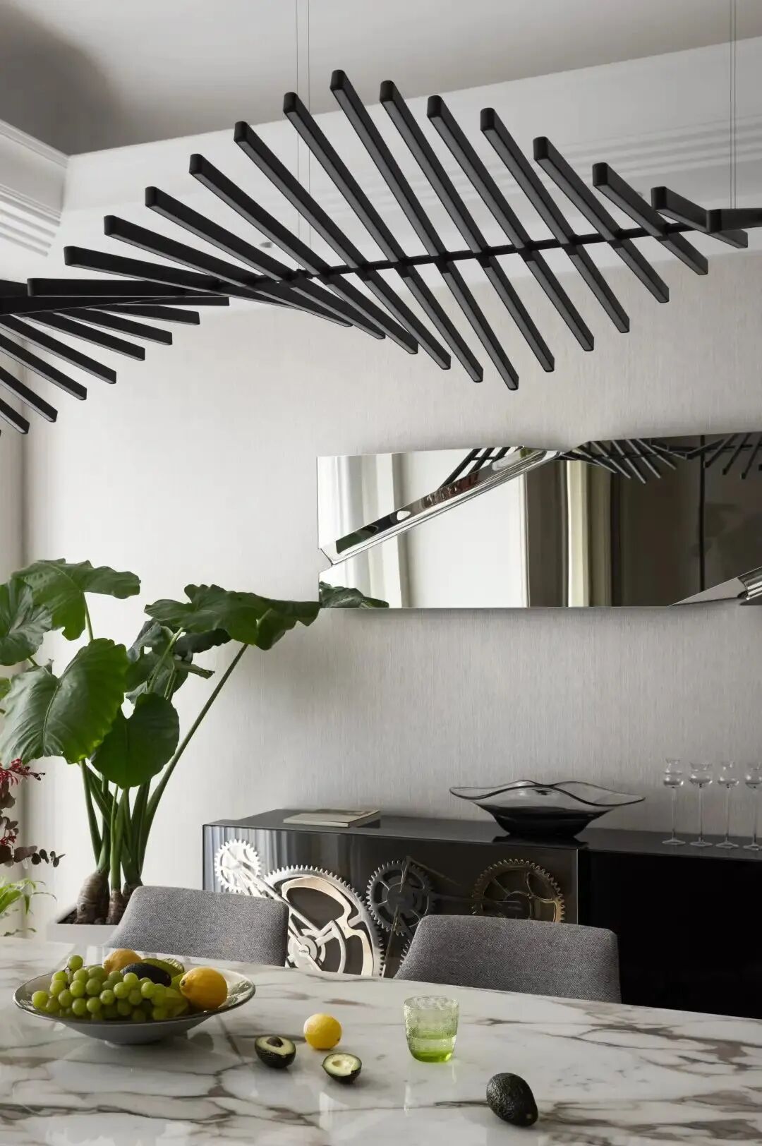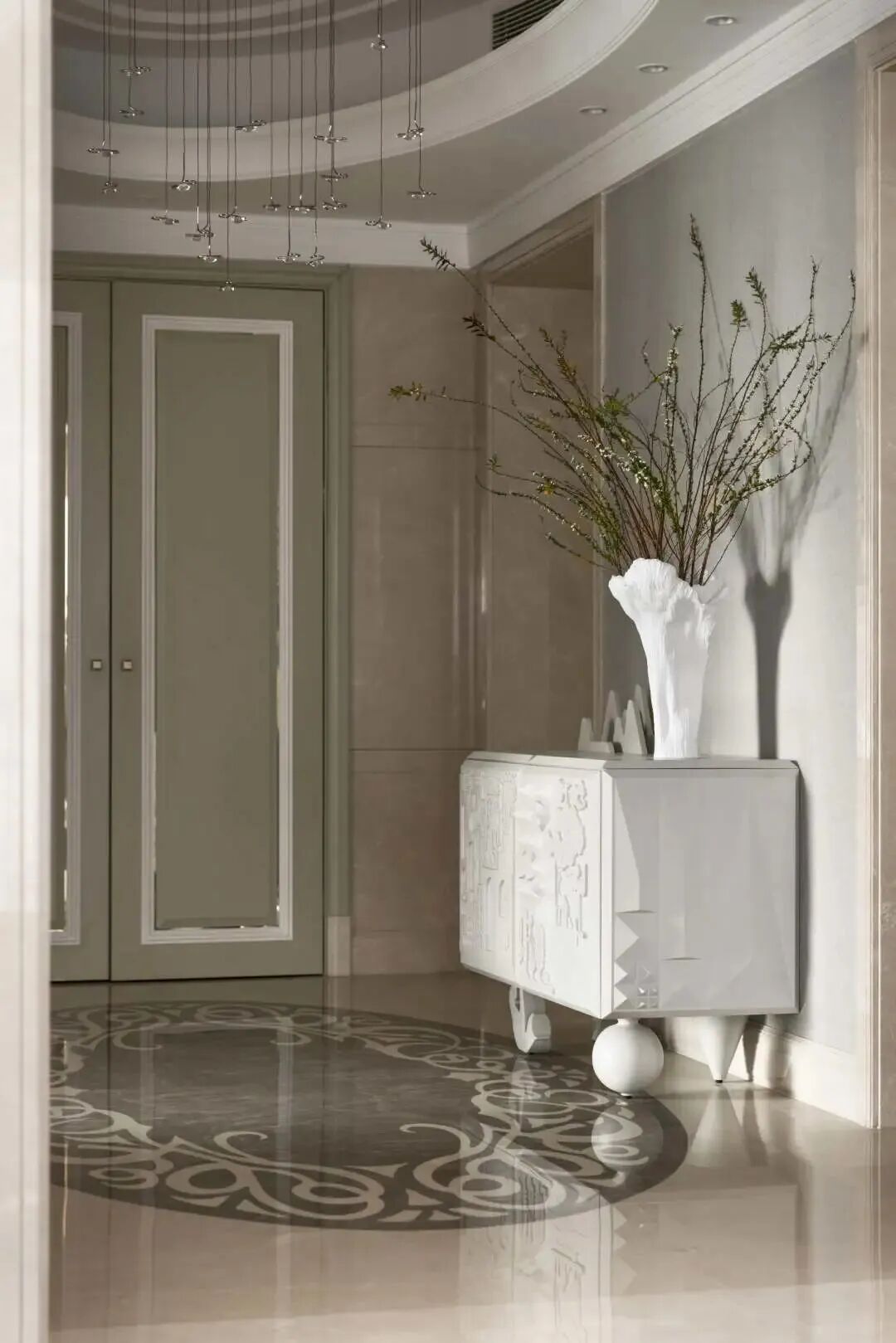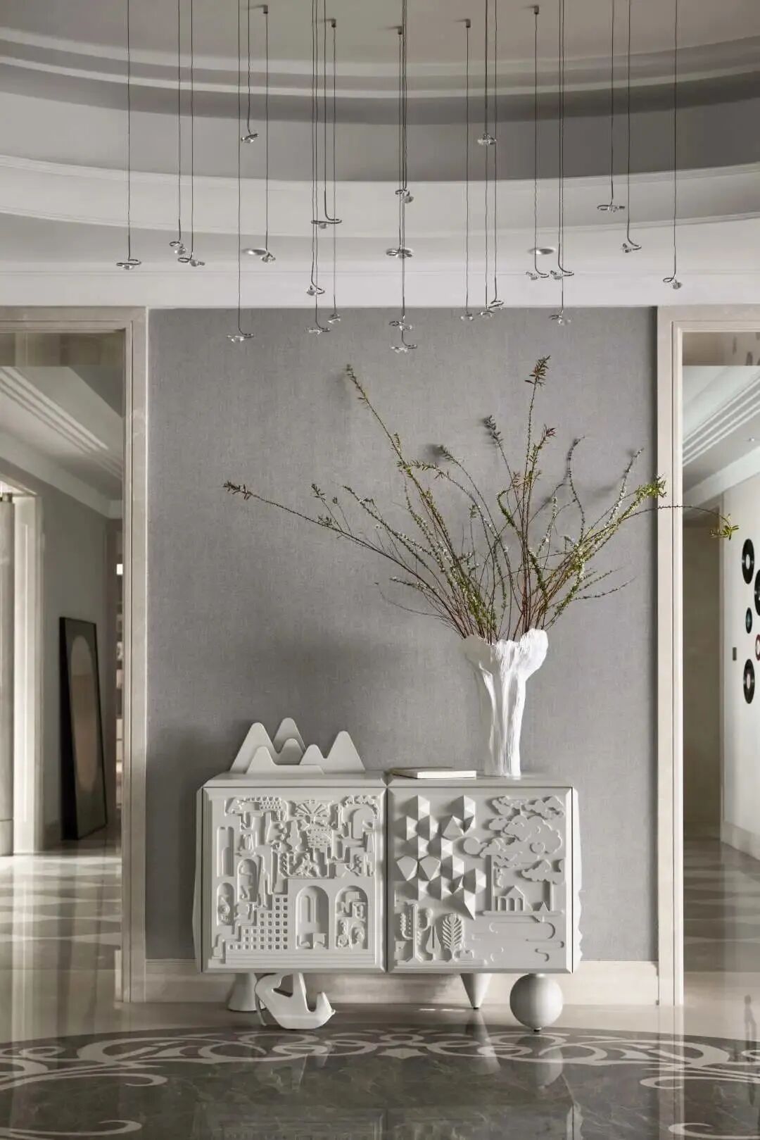 从玄关进入,Vivian选用了Bdbarcelona的一个充满雕塑立体感的装饰柜,艺术价值极高。在铺满欧式雕花的大理石的上方用了Catellani&Smith非常极简的一款灯,精巧的造型设计为每次归家注入仪式感。