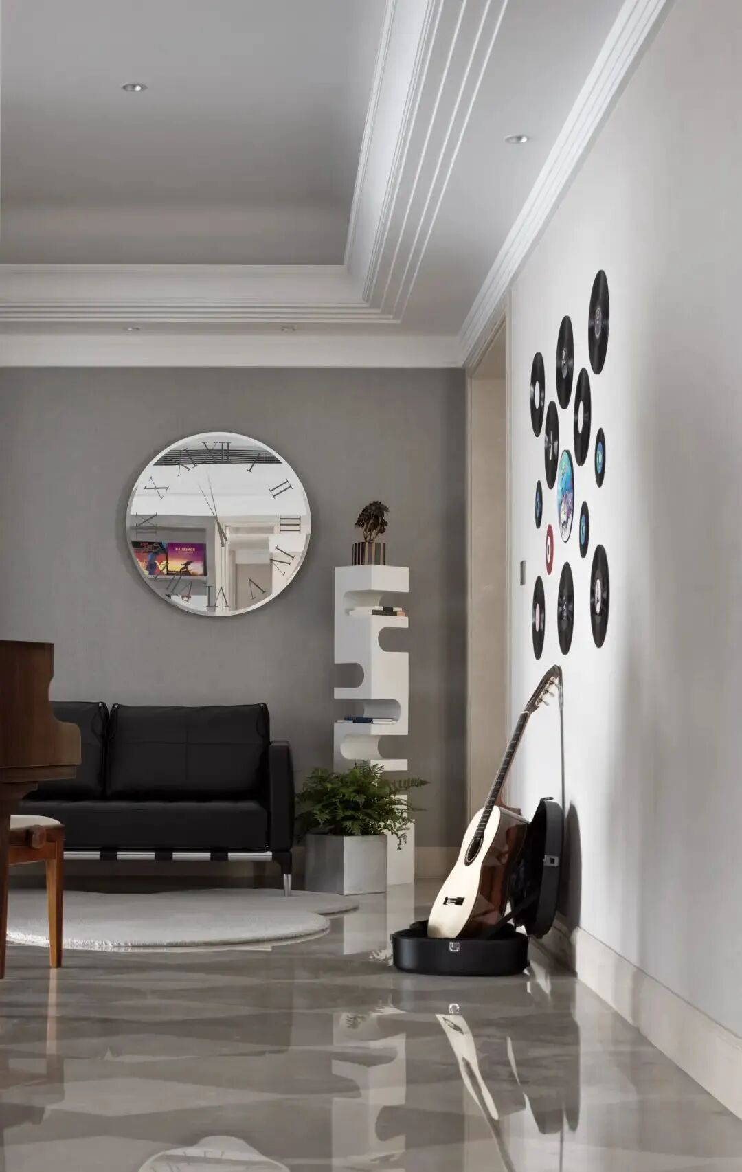 软装设计师Vivian与他有着审美的共鸣,她希望打造一个“凡凡的家”,把他喜欢的汽车、黑胶、钢琴、手办都放置在这个家中,让硬朗清晰的空间表达与满含韵味的古典元素相交汇,从而展现出主人的性格。